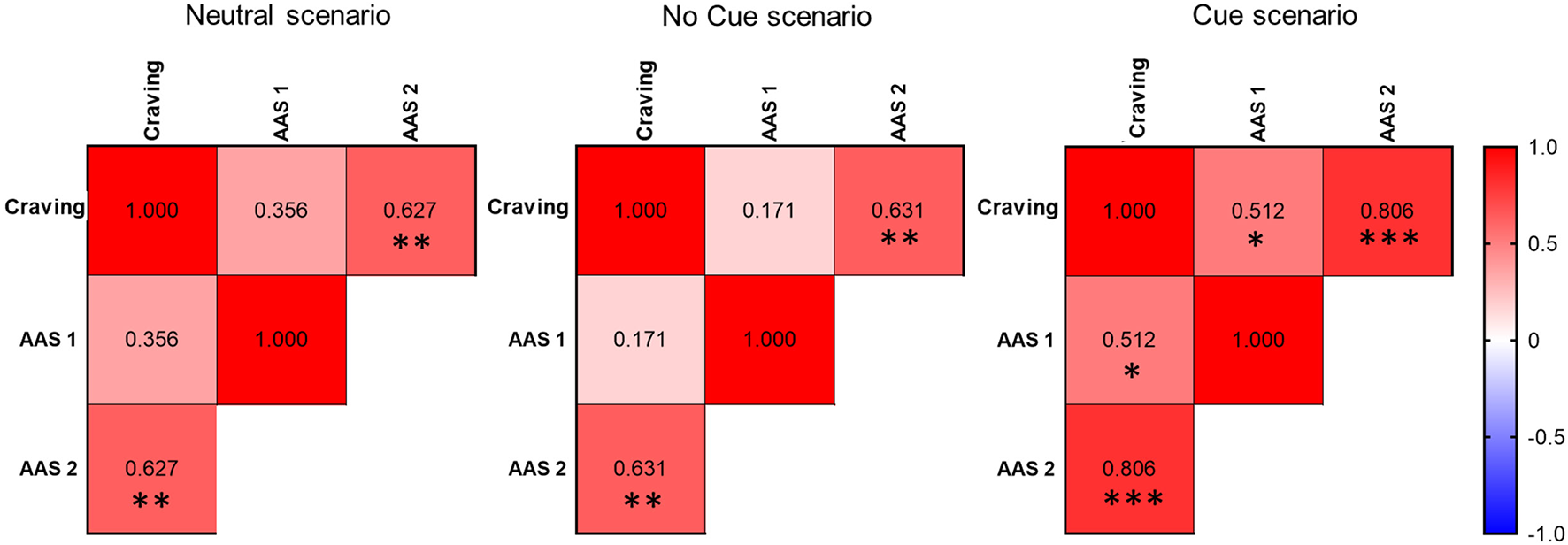 Correlational analysis. Heat map of correlations between craving, AAS 1, and AAS 2 scores measured after the neutral scenario, after the No Cue scenario, and after the Cue scenario. Spearman’s Rho are shown in the cells. * (p < 0.05), ** (p < 0.01) and *** (p < 0.001).