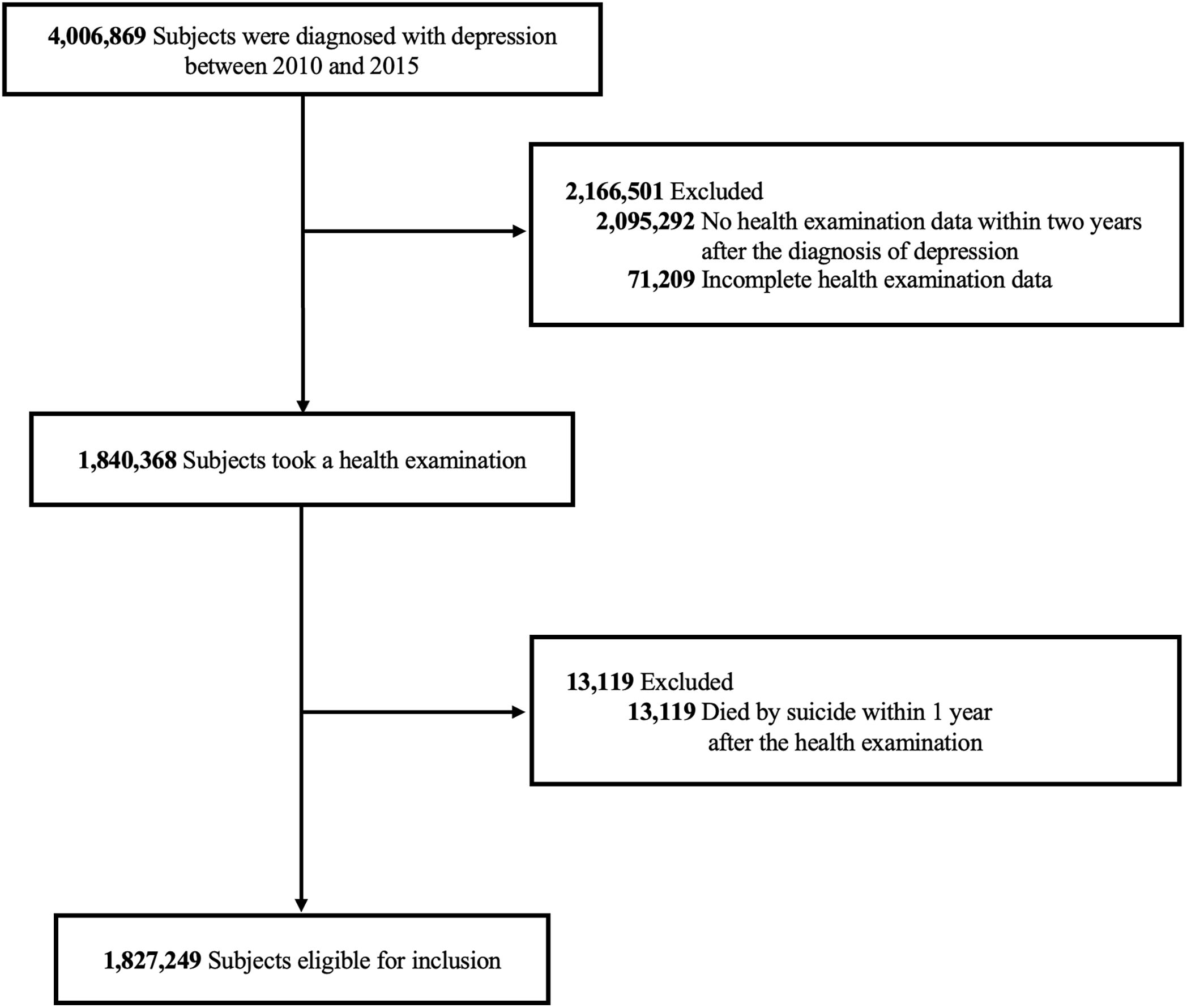 We followed the participants from the index date of January 1, 2010, until December 31, 2022, or until a suicide occurred during this period, which defined the follow-up period. Patient death and the end of the follow-up period were considered censoring events. Due to its retrospective design and the utilization of de-identified data, this study received an exemption from review by the Institutional Review Board of Samsung Medical Center (No. SMC 2022-10-140).