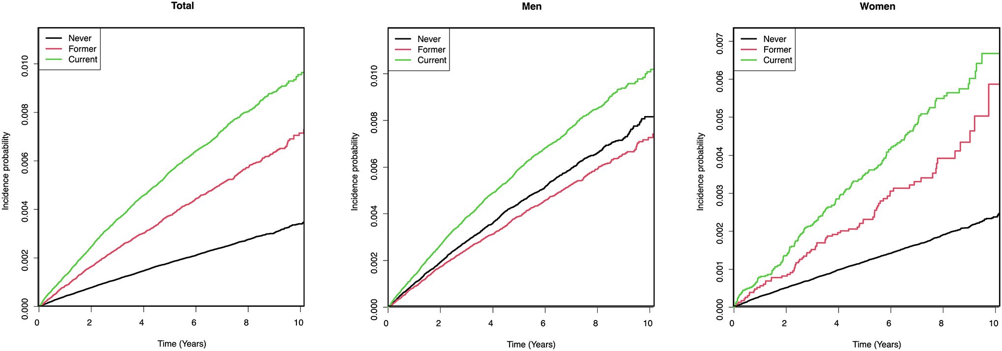 Figure 2 presents Kaplan–Meier survival curves showing the cumulative incidence of suicide according to smoking status. In both genders, current smokers exhibited the highest cumulative suicide risk, followed by former smokers and never smokers. The cumulative suicide risk increased more steeply by smoking status in women than in men, especially among current smokers. Among men, former smokers showed slightly lower cumulative risk than never smokers. The curves appeared nearly linear over time, indicating a steady accumulation of suicide risk throughout the follow-up period.