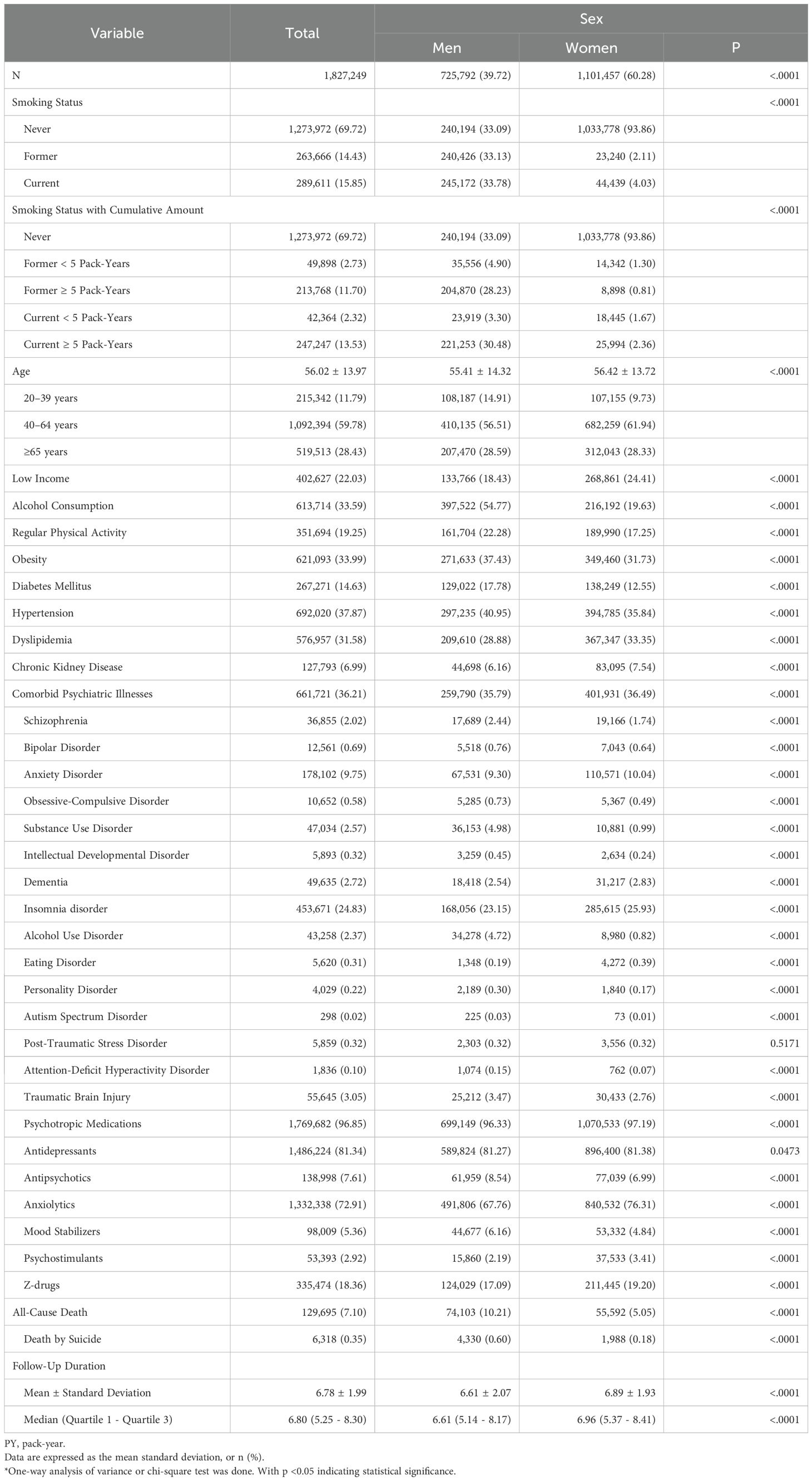 Table 1 summarized the baseline demographic and clinical characteristics of the study population by sex. Of the total 1,827,249 individuals with depression, 60.3% were women. The mean age was 56.02 years, with a majority aged between 40 and 64 years.