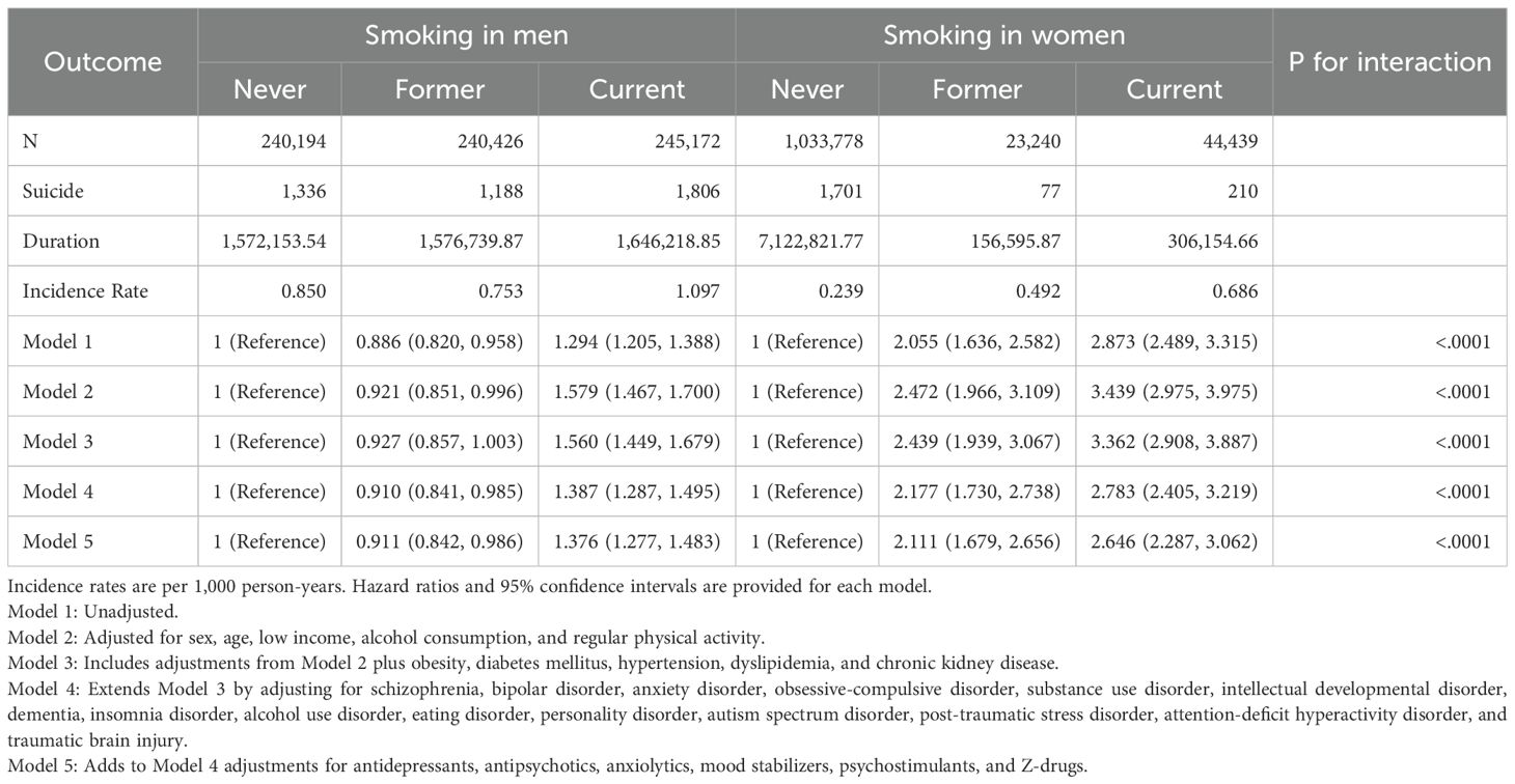 Results: Over a median follow-up of 6.8 years, 6,318 individuals (0.35%) died by suicide. Smoking was associated with increased suicide risk in both men and women, with a stronger association in women. Current smoking showed a higher risk in women (HR = 2.646, 95% CI: 2.287-3.062) compared to men (HR = 1.376, 95% CI: 1.277-1.483). In men, factors such as younger age and alcohol consumption intensified this association, whereas in women, low income was a significant modifier; the highest suicide risk was observed in low-income former smokers.