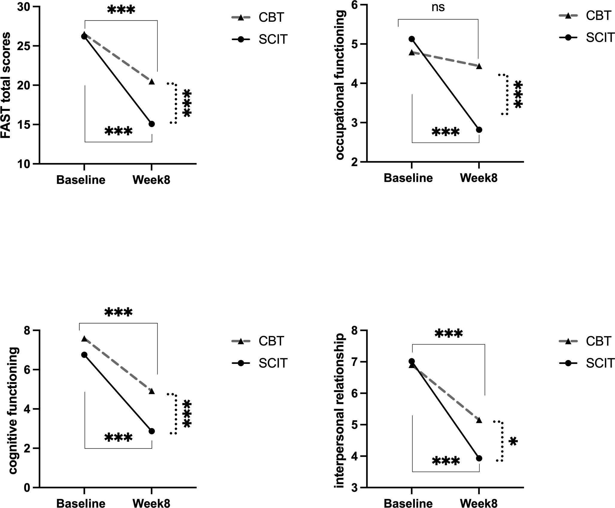 Figure 2. The intervention*time interaction effects on FAST and occupational, cognitive, interpersonal domains pre to post 8-week intervention in SCIT and CBT group. SCIT, social cognition and interaction training; CBT, cognitive-behavioral therapy; FAST, Functional Assessment Test Short Form; solid lines represent the time effect within groups;dashed lines indicate the between-group comparison at week 8;***: p < 0.001; *: p < 0.05.