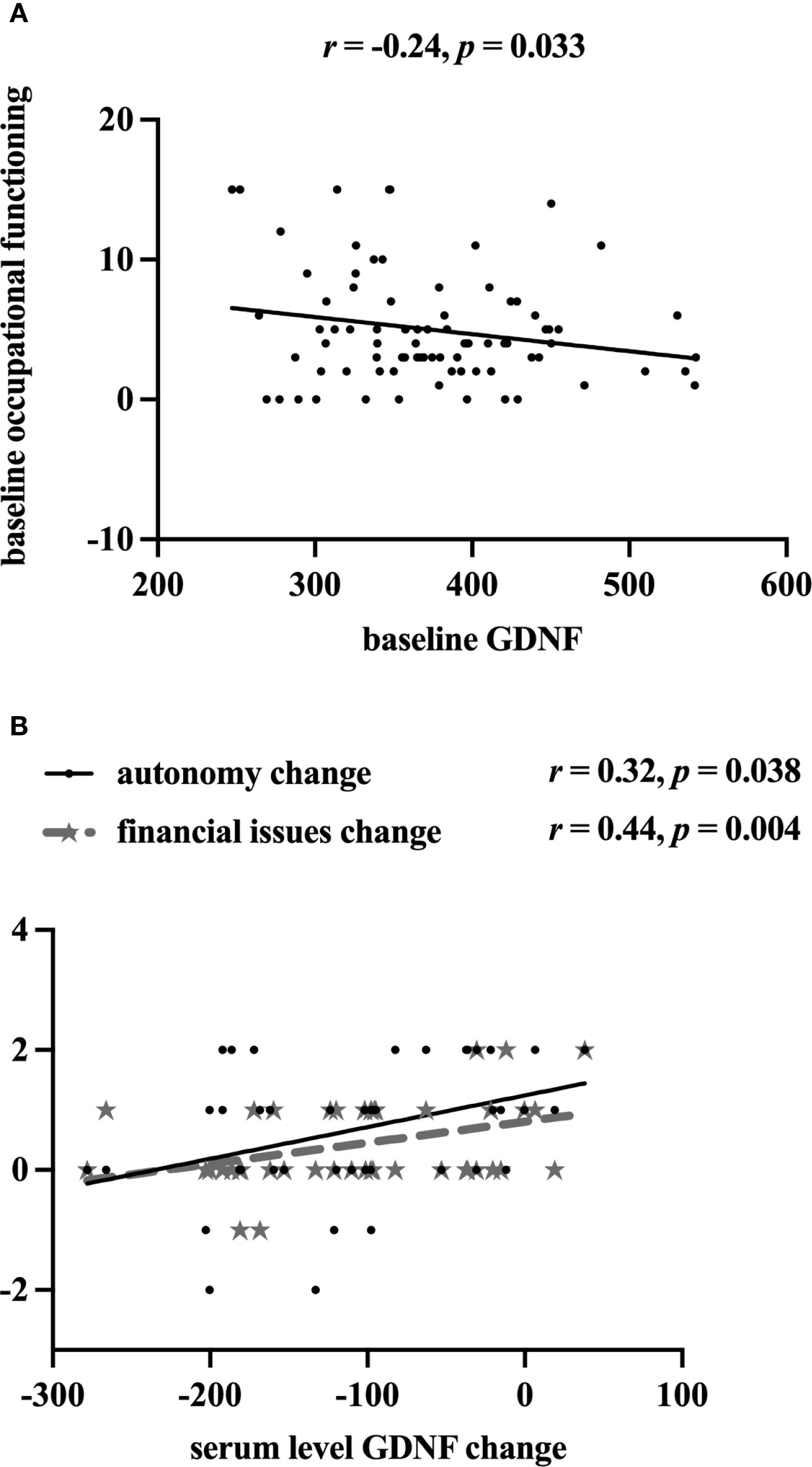 Using baseline data, after controlling for age, educational years, and duration of MDD, partial correlation analysis yielded that occupational functioning was negatively associated with serum GDNF levels (r (79) = -0.24, 95% CI = [–0.43, –0.02], p = 0.033) in all FEDN MDD patients, see Figure3A. Further analyses based on intervention measures revealed that changes in serum GDNF levels were significantly associated with changes in domains of autonomy (r (40) = 0.32, 95% CI = [0.02, 0.57], p = 0.038), and financial issues (r (40) = 0.44, 95% CI = [0.15, 0.65], p = 0.004) in SCIT group, see Figure 3B. To account for multiple comparisons across the examined serum biomarkers and social functioning, false discovery rate (FDR) correction was applied using the Benjamini–Hochberg procedure, significant results were considered at an FDR-adjusted p-value threshold of < 0.05. However, after correction, only the correlation between GDNF difference and financial issues difference still holds statistical significance (FDR-adjusted p = 0.49). Besides, there was no correlation between changes in FAST (including its six domains) and changes in serum GDNF or BDNF level were found in CBT group.