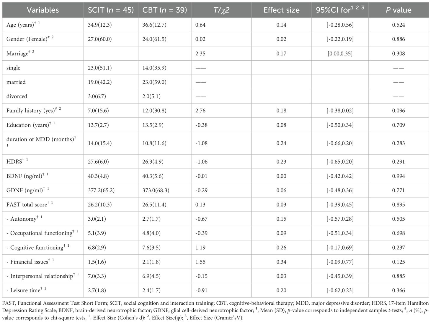 According to Gpower 3.1, a medium level effect size (f = 0.25) (see Cohen’s criteria) was set, with an alpha (α) level set at 0.05 (two-tailed) and a desired power (1-β) of 0.80. A total sample size of N = 34 resulted in a 0.81 actual power. Actually, ninety FEDN MDD patients were recruited at baseline. According to the per-protocol analysis principle, 6 patients (4 for SCIT group, 2 for CBT group) were excluded because they uncompleted all assessments during 8 consecutive weeks. There were no differences in demographics, HDRS, FAST including its six domains, and serum BDNF/GDNF levels between excluded and included patients (all p’s > 0.05). Finally, 84 FEDN MDD patients completed the interventions and all assessments during the 8-week follow-up, including 45 patients for SCIT group and 39 patients for CBT group. There was no significant difference in gender (χ2 = 0.02,φ = 0.02, p = 0.886), age (t = 0.64, Cohen’s d = 0.14, p = 0.524), education years (t = -0.38, Cohen’s d = 0.08, p = 0.709), marriage status (χ2 = 2.35, Cramér’sV = 0.17, p = 0.308), the current duration (t = -1.08, Cohen’s d = 0.24, p = 0.283), and family history (χ2 = 2.76, φ = 0.18, p = 0.096) between SCIT group and CBT group, see Table 1. The type of antidepressants according to flexible dosage was also not significantly different between groups (χ2 = 0.44, Cramér’sV = 0.07, p = 0.994). Moreover, we compared the scores of HDRS, FAST including its six domains, as well as serum BDNF and GDNF levels between groups using baseline data, with results revealing no statistical differences in clinical-related variables (all p’s > 0.05), see Table 1.