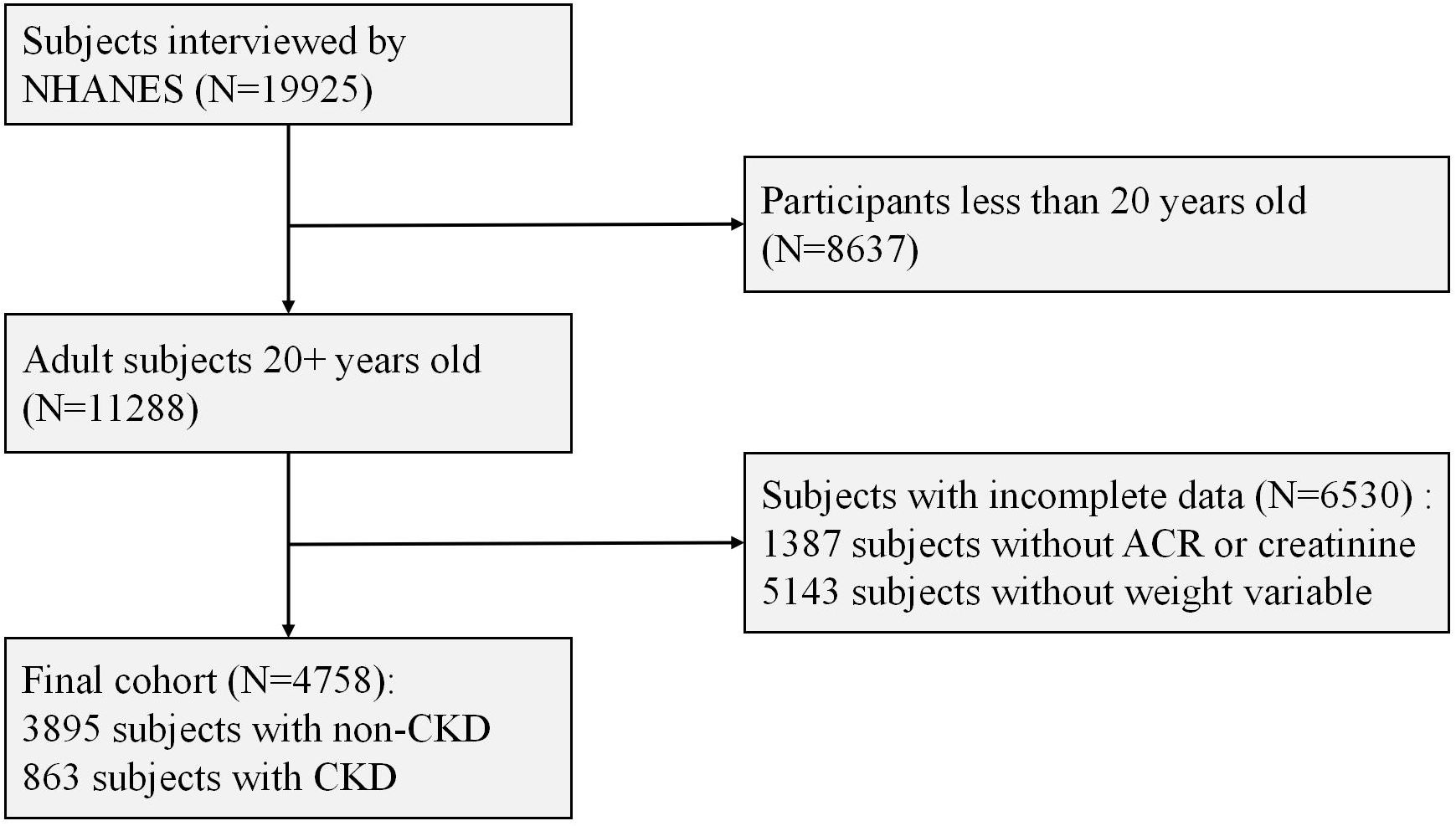Figure 1. Flow chart of patient selection. Source: NHANES, 2015–2016 and 2017–2018 cycles. NHANES, National Health and Nutrition Examination Survey; CKD, Chronic Kidney Disease; ACR, Albumin-to-Creatinine Ratio.