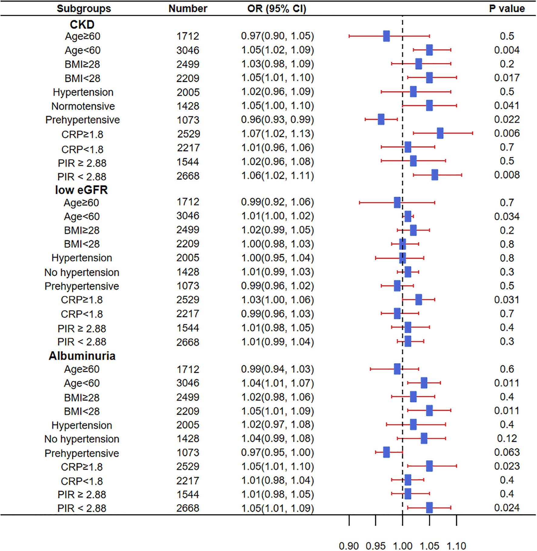 Figure 2. Impact of sleep disorders in different subgroups on the prevalence of CKD, low eGFR, and proteinuria. OR, Odds Ratio; CKD, Chronic Kidney Disease; BMI, Body Mass Index; CRP, C-Reactive Protein; PIR, Ratio of family income to poverty; eGFR, estimated Glomerular Filtration Rate. Source: NHANES, 2015–2016 and 2017–2018 cycles.