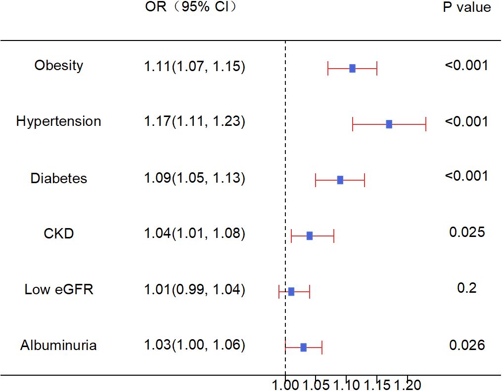 Sleep disorders in adults were found to be correlated with obesity, hypertension, diabetes, CKD, and proteinuria, but no association was observed with low eGFR (Figure 3).