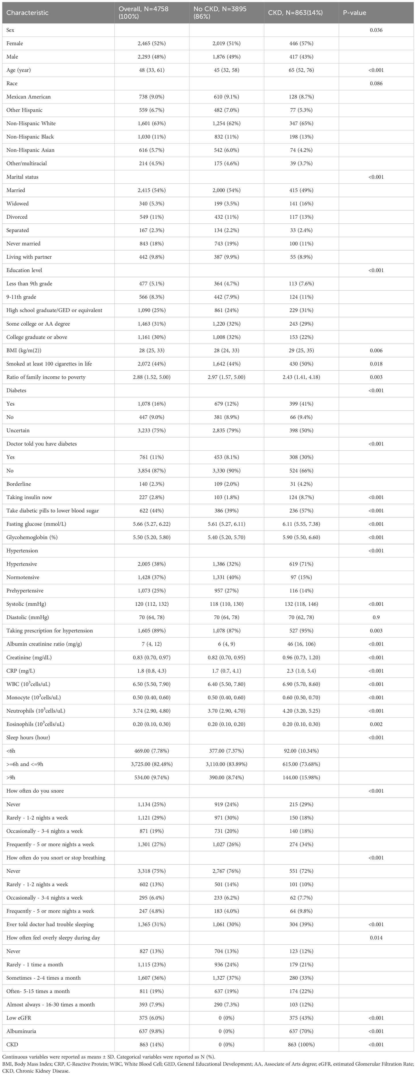 Results: Among 4,758 participants, 863 (14%) were diagnosed with chronic kidney disease (CKD). Elevated C-reactive protein (CRP) levels and differential leukocyte counts were observed in the CKD cohort. CKD was associated with increased reports of snoring, sleep apnea, and sleep disturbances, along with higher fatigue levels. A significant positive association between CKD and sleep difficulties persisted in adjusted models. Infrequent snoring (1–2 times per week) demonstrated a negative association, whereas excessive daytime sleepiness (16–30 times/month) correlated positively with CKD. Significant associations between sleep disorders and CKD were observed in participants aged <60, with a BMI <28 kg/m², normal blood pressure, and CRP ≥1.8 mg/L. Sleep disorders were found to be correlated with obesity, hypertension, diabetes, CKD, and proteinuria. Notably, CKD patients with sleep difficulties had markedly elevated CRP levels compared to those without sleep issues, while other inflammatory markers were similarly elevated (P < 0.001).