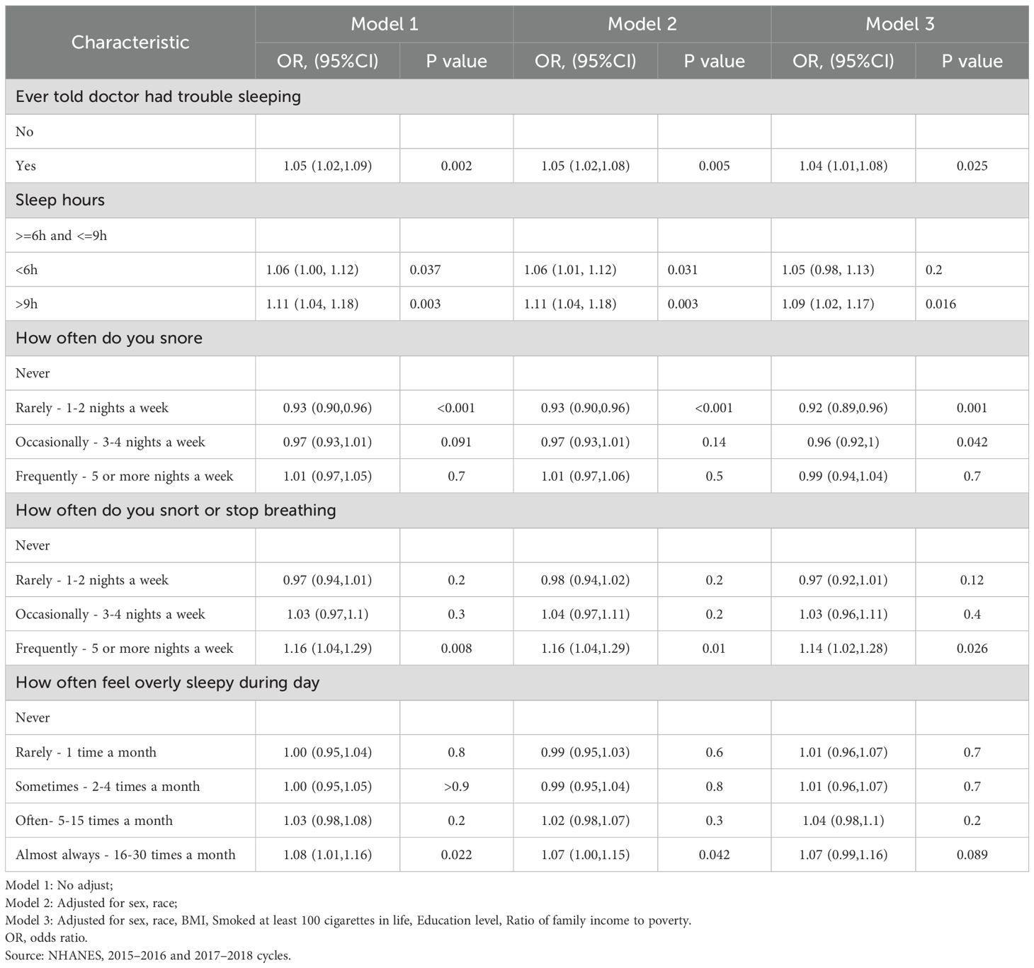The ICSD-3 diagnostic criteria for sleep disorders systematically analyze 241 distinct diagnostic criteria and categorize them into nine types, including clinical manifestations, objective markers, distress, and disability (23). Sleep disorders encompass a wide range of conditions, from obstructive sleep apnea to rapid eye movement sleep behavior disorder. In the diagnosis of sleep disorders, doctors can initially determine the presence of a sleep disorder by thoroughly understanding the patient’s medical history, including sleep patterns, daytime dysfunction, and related symptoms. Traditional polysomnography is considered the gold standard for diagnosing sleep disorders. It can record multiple physiological signals, including electroencephalography, electrooculography, and electromyography, thereby providing a comprehensive assessment of the various stages and quality of sleep (24). Self-assessment scales and questionnaire tools play an important role in the preliminary screening and assessment of sleep disorders. These tools typically include standardized scales, such as the Pittsburgh Sleep Quality Index and the Epworth Sleepiness Scale, which can help doctors quickly evaluate patients’ sleep quality and daytime sleepiness levels. The data in this article comes from the NHANES database, with participants being a large civilian population. The assessment of sleep disorders in this study is based on questionnaire surveys. Although lacking the precision of polysomnography or activity monitors, this method provides a cost-effective screening approach, which is particularly valuable in large-scale observational studies.