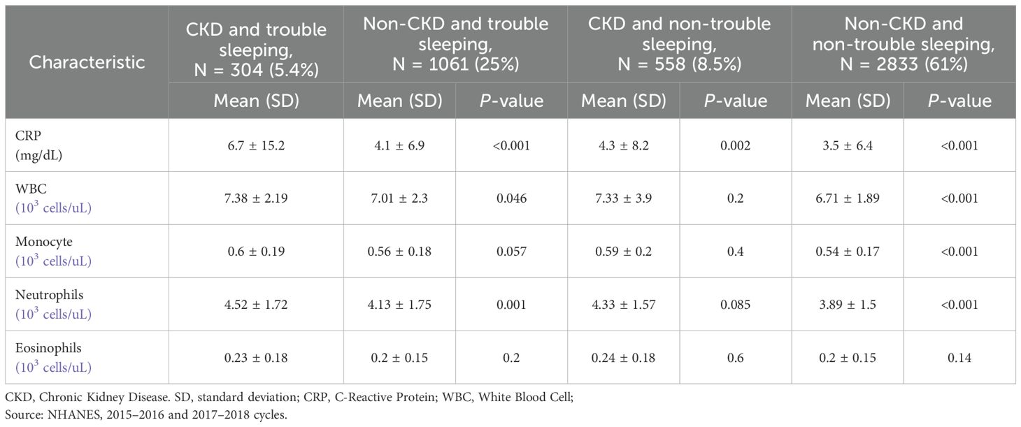 In CKD patients, those reporting sleep difficulties had a higher average CRP level compared to those without sleep issues. No significant differences were observed in average white blood cell count, monocyte count, neutrophil count, and eosinophil count. In participants with sleep difficulties, CKD patients had a significantly higher CRP level than non-CKD participants. CRP levels, average white blood cell count, monocyte count, and neutrophil count were markedly higher in CKD patients with sleep difficulties than in CKD-free individuals (P < 0.001), while eosinophil count showed no significant difference (Table 3).