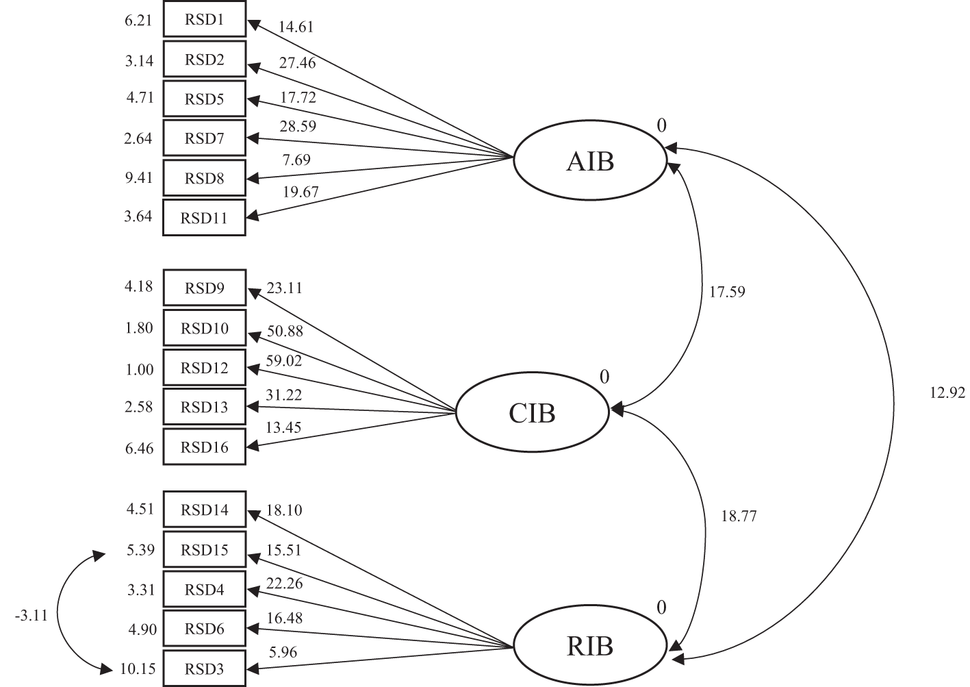 CFA analysis revealed that Goodness of Fit Index (.95), Comparative Fit Index (.94) Incremental Fit Index (.94), Root Mean Square Error of Approximation (.08), and Chi-square (203.11) were at least acceptable (Figure 1). Intercorrelations (covariances) between the three factors were moderate to high; RIB and AIB (r = .73, p <.05), RIB and CIB (r = .77, p <.05), and AIB and CIB (r = .73, p <.05). Examination of the standardized solution outcomes revealed no problems in the model coefficients. In the model, t-test values range from 5.96 to 59.02 and were statistically significant (Figure 2). Internal consistency (α, ω) (95% CI) of the RESD-W subscales were: AIB α = .75 (.69,.82), ω = .77 (.71,.82); CIB α = .83 (.79,.87), ω = .85 (.81,.89); RIB α = .70 (.63,.77), ω = .72 (.65,.78); Total α = .84 (.79,.88), ω = .82 (.78, 86). Convergent validity, based on the AVE was satisfactory for AIB (.54) and CIB (.59), but not for RIB (.39). Regarding discriminant validity, the shared variance (SV) between all pairs was lower than the AVE, indicating discriminant validity: AIB-CIB (SV = .11), AIB-RIB (SV = .09), and CIB-RIB (SV = .21).