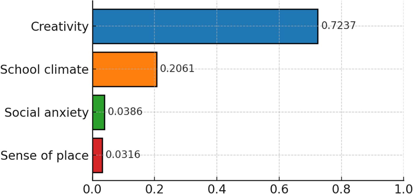 Results: Psychological resilience was predicted by four factors, in order of significance: creativity, school climate, social anxiety and sense of place. Additionally, creativity emerged as the most significant predictor of psychological resilience with a notable margin over the other three factors.