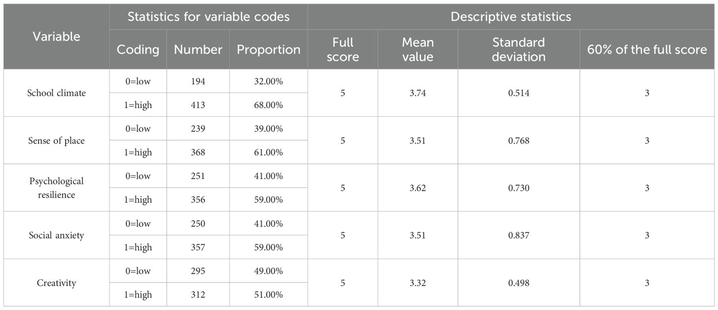 The present study was conducted at a college in Sichuan Province, accommodating more than 17,000 students. Before finalizing the study design, an exploratory focus interview was held with five volunteer respondents to identify the possible predictors of psychological resilience. Creativity, school climate, sense of place and social anxiety were estimated as predictive factors. The survey materials and design were submitted to the Ethics Review Committee of Chengdu Normal University and the principals of sample schools. Following a review of the ethical considerations and research requirements, consent was obtained, and the survey was administered to the students. Prior to participation, all students provided electronic informed consent. The inclusion criteria were threefold: (1) full-time undergraduate students currently enrolled in the college, (2) aged between 18 and 25 years, and (3) having regular smartphone use. Exclusion criteria were: (1) students with self-reported severe psychological disorders or cognitive impairments, and (2) incomplete questionnaire responses. Using a convenient sampling method, a total of 607 voluntary participants filled out the questionnaire. Among them, 304 were sophomores and 303 were juniors. After data collection, we examined the validity of the questionnaires and found out 607 reliable questionnaires. Among the sample group, 155 were male (25.5%) and 452 were female (74.5%), reflecting the predominance of female students in Chinese normal universities, which resulted in a higher proportion of female respondents. In terms of geographic background, 434 students (71.5%) were from rural areas, while 173 (28.5%) were from urban areas, consistent with the demographic composition of college students in the western region of China. Participants’ ages ranged primarily from 18 to 23, with a small minority older than 23. Specifically, 22 participants (3.6%) were 18 years old, 143 (23.6%) were 19, 211 (34.8%) were 20, 159 (26.2%) were 21, 46 (7.6%) were 22, and 23 (3.8%) were above 23.