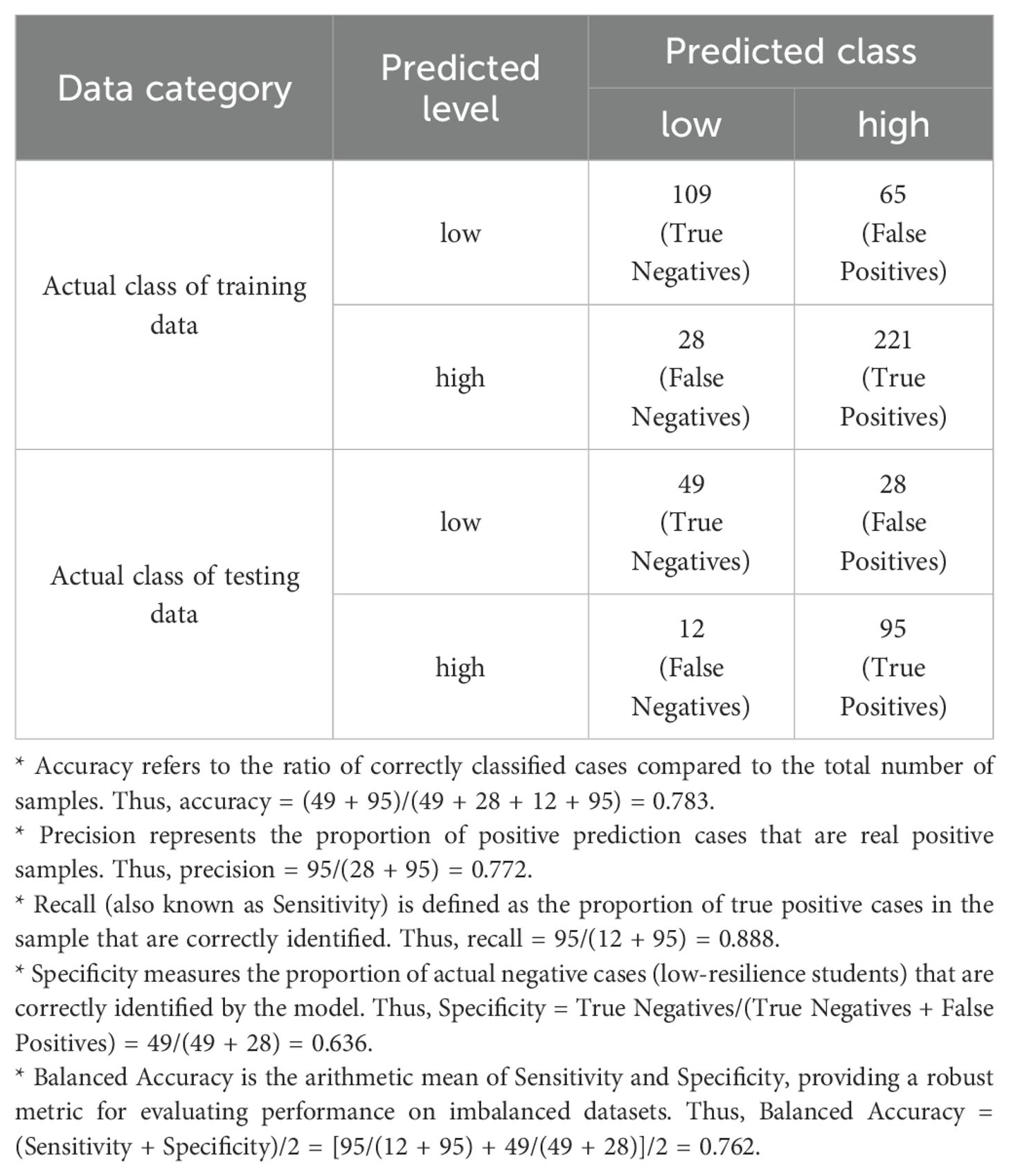The confusion matrix and classification accuracy are presented respectively in Table 2 and Table 3. The model accuracy for the testing data set is 78.26%. On the basis of computation rule of precision and recall, the model’s precision with the testing data set is 77.23% and the model recall of the testing data set is 88.79%. In this classification, the AUC value of the training data set is 0.801 and the AUC of the testing data set is 0.821, which is directly obtained from the model evaluation report. According to Fawcett (79), the AUC value of our model for predicting psychological resilience is greater than 0.5, indicating that the model is more accurate than a random guessing. The corresponding Gini coefficient was 0.601 for training data and 0.642 for testing data. Furthermore, the F1-Score is about 82.6% in our model, which can be calculated as F1-score = 2 × (Precision × Recall)/(Precision + Recall).
