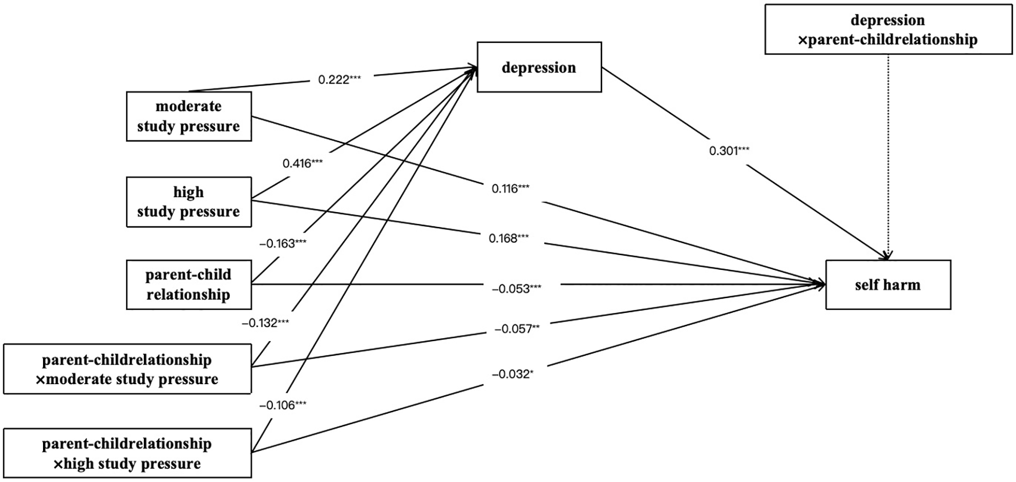 Self-harm has become a significant and increasing global problem in children and adolescents. In this study, we tested a moderated mediation model to examine the impact of study pressure and depression, and one protective factor, good parent-child relationship, on self harm.