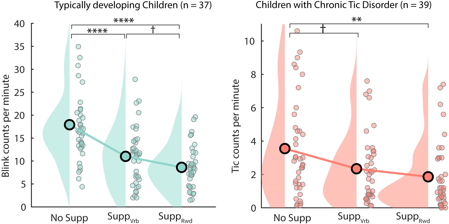 Two graphs compare blink and tic counts in children. The left graph shows typically developing children's blink counts per minute decreasing from “No Supp” to “Supp_Rwd”. The right graph shows children with chronic tic disorder's tic counts also decreasing from “No Supp” to “Supp_Rwd”. Significant statistical differences are indicated by asterisks.