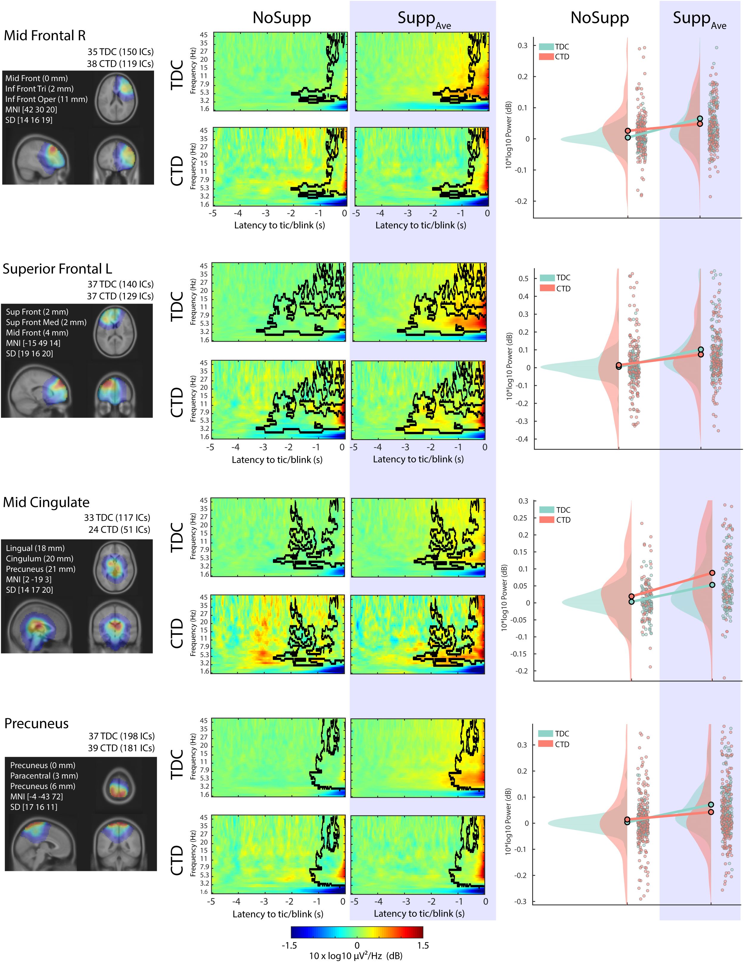 Figure 2. The four IC clusters that showed a main effect of Suppression, all of which showed a power increase during suppression. Left: The relative dipole density after applying 3-D Gaussian smoothing with FWHM 20 mm. Middle: The 2x2 event-related spectral perturbation (ERSP) plots. The baseline period was defined between -5 to -4 s relative to blink/tic onset. The black contour indicates the significance mask at p < 0.05 corrected for cluster-level family-wise error-rate (FWER) control. Right: The scatter plot and distribution of the mean value within the significance mask across ICs. TDC, typically developing children; CTD, chronic tic disorder.