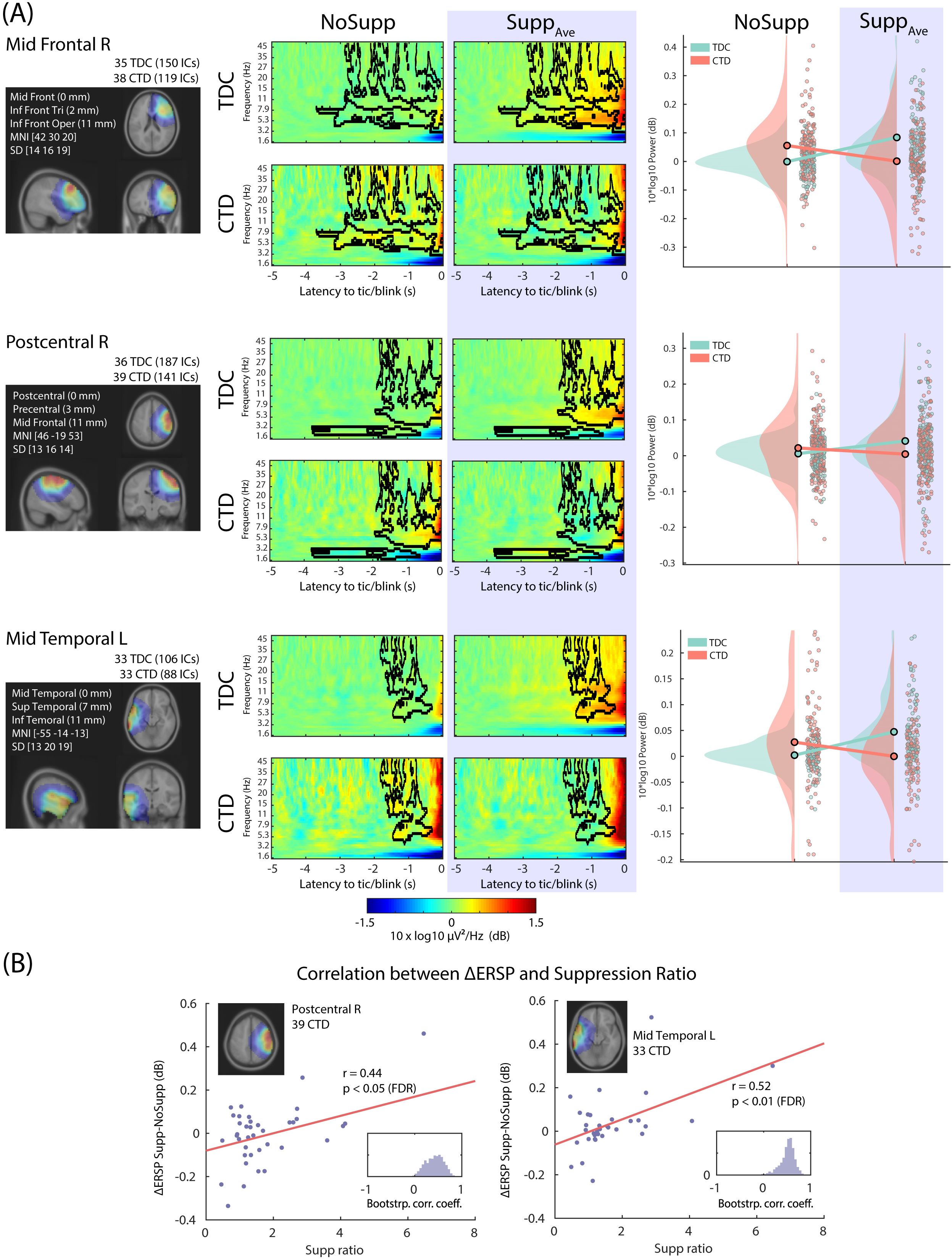 (A) Series of brain images with EEG data plotting latency to tic/blink against power for different brain regions and conditions: NoSupp and Supp\(_{Ave}\). Each row compares typically developing controls (TDC) and clinical tic disorder patients (CTD). The rightmost graphs for each region visualize data via violin plots. (B) Scatter plots show the correlation between ΔERSP and suppression ratio for Postcentral R and Mid Temporal L areas, with brain images, correlation coefficients, significance levels, and bootstrap correlation coefficients.