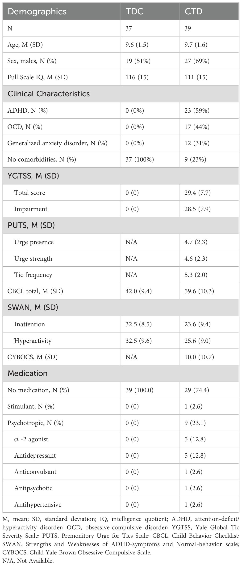 The children were recruited from the community through social media advertisements, community organizations, and local schools, as well as from the academic medical clinics through primary care physicians and local clinicians. After receiving verbal and written explanations of study requirements, and prior to any study procedures, all parents/participants provided written permission and assent as approved by the Institutional Review Board. A total of 115 children were recruited. In the current study, we focused on those who showed a minimum of 15 tics and blinks during sessions. A subset of 76 children, including 37 typically developing children (TDC, 19 males, mean age 9.6, SD 1.4, range 8 - 12) and 39 children with tic disorder (CTD, 27 males, mean age 9.7, SD 1.6, range 8 - 14), was included in the current study. There was 1 child in CTD comorbid with ADHD on stimulants who was asked to discontinue 24 hours prior to coming into the lab, and 9 children on other psychotropic medicines. The demographic data of this subset is summarized in Table 1.
