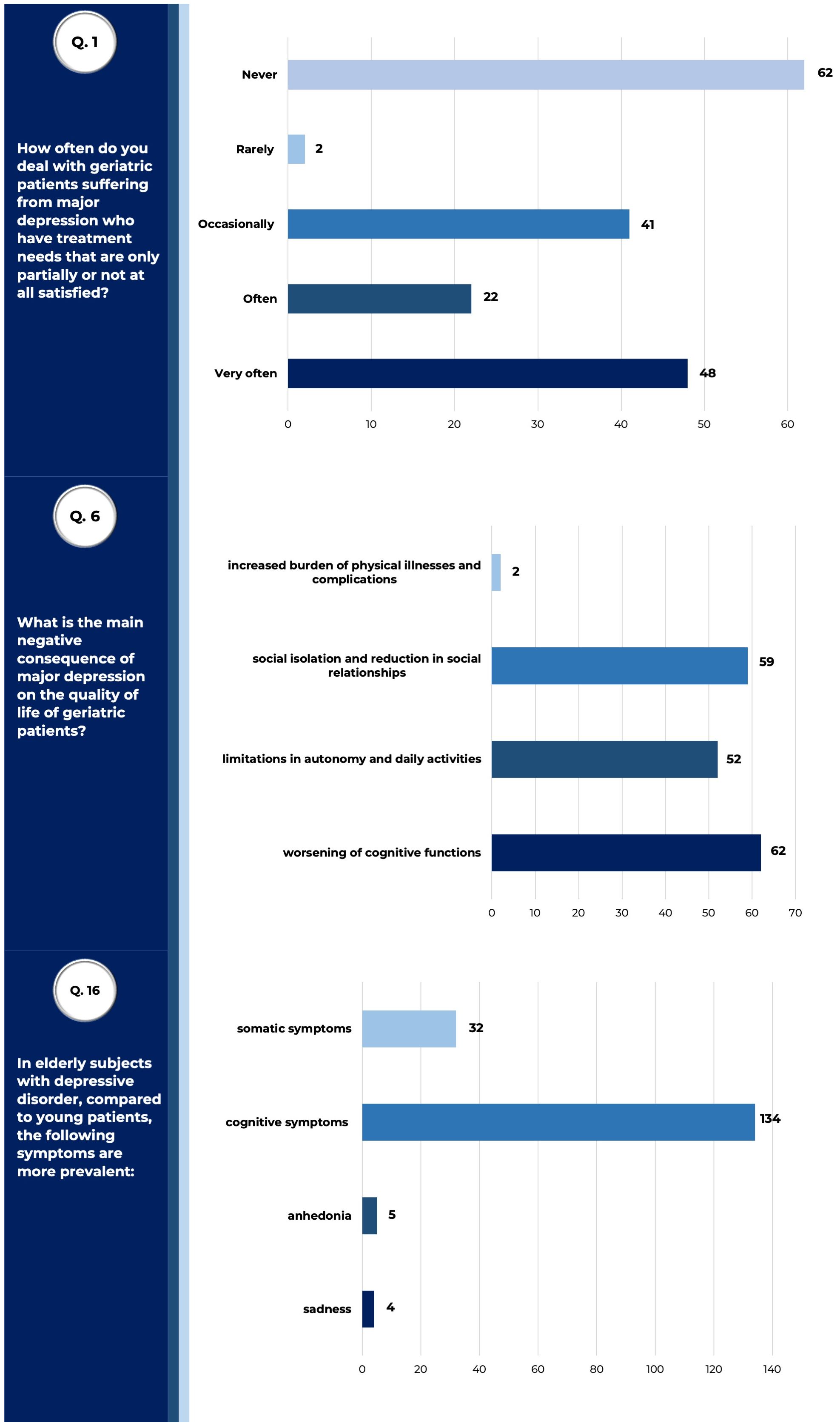 Figure 1. Prevalence and clinical impact of geriatric depression. Answers to queries 1, 6, and 16 of the questionnaire submitted to SIGG members, relative to results described. Raw data are reported (tot. surveyed physicians =175).