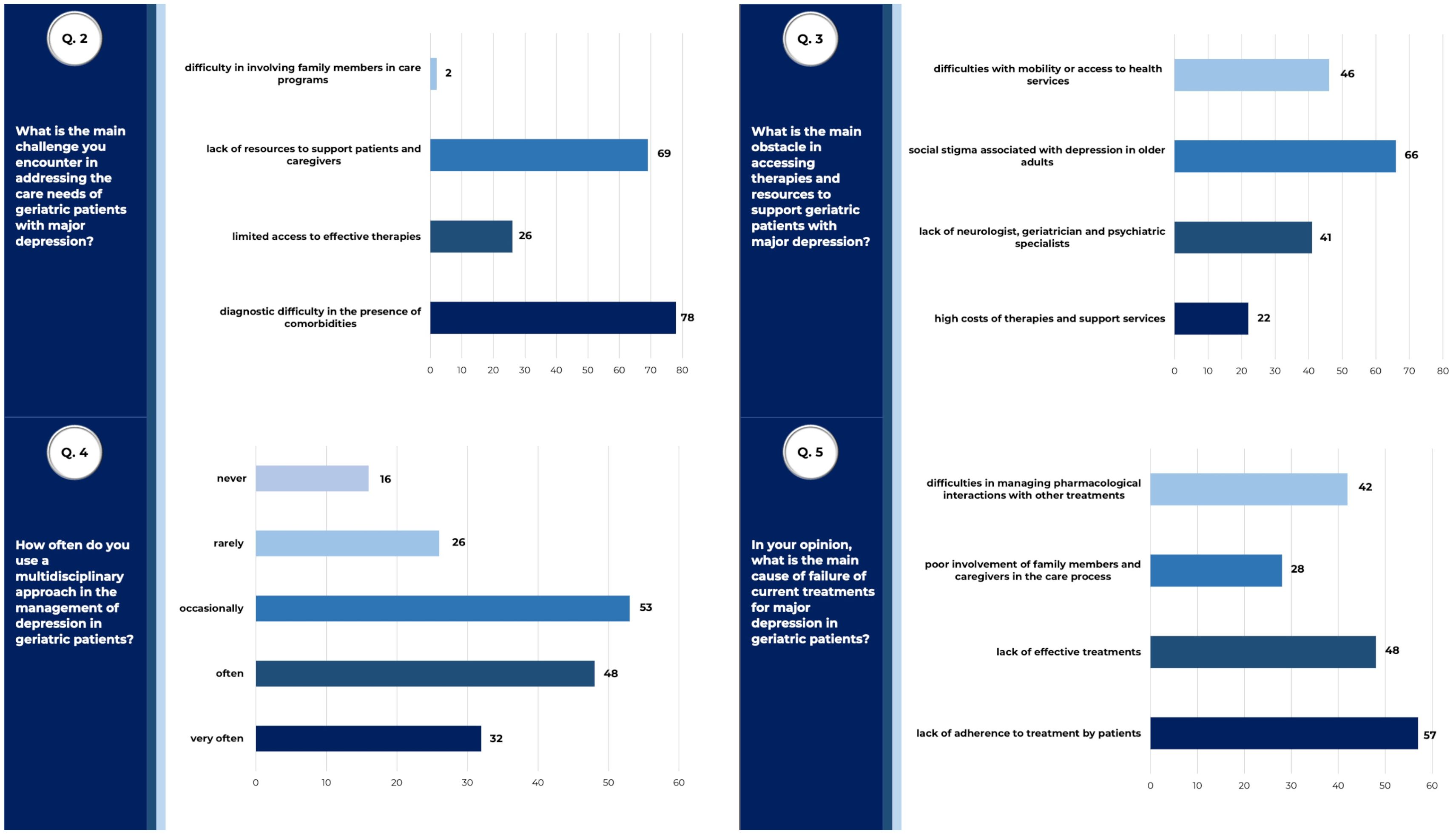 Figure 2. Unmet needs in approaching and treating geriatric depression. Answers to queries 2, 3, 4 and 5 of the questionnaire submitted to SIGG members, relative to results described. Raw data are reported (tot. surveyed physicians =175).