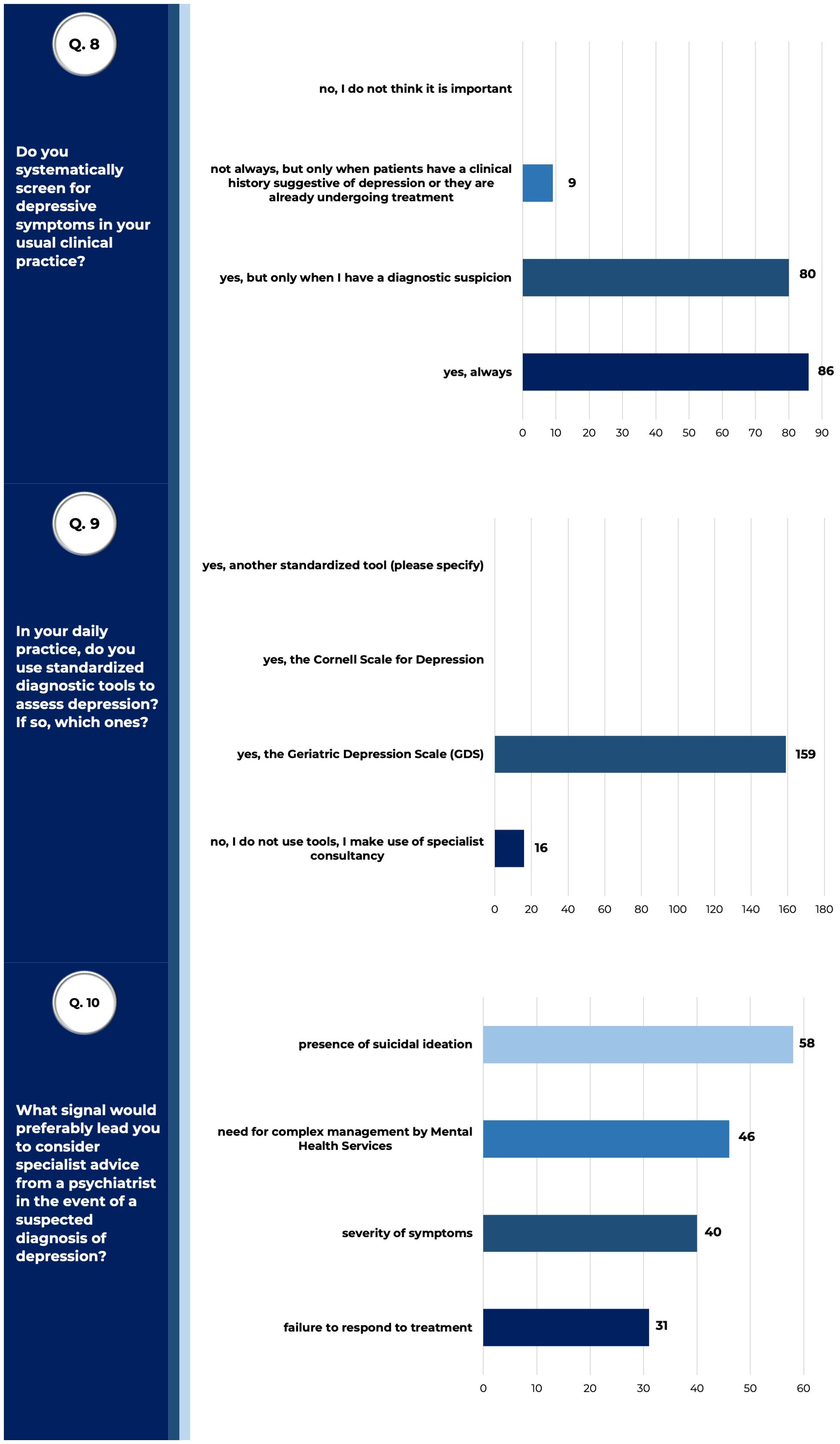 Figure 3. Managing geriatric depression in clinical practice. Answers to queries 8, 9 and 10 of the questionnaire submitted to SIGG members, relative to results described. Raw data are reported (tot. surveyed physicians =175).