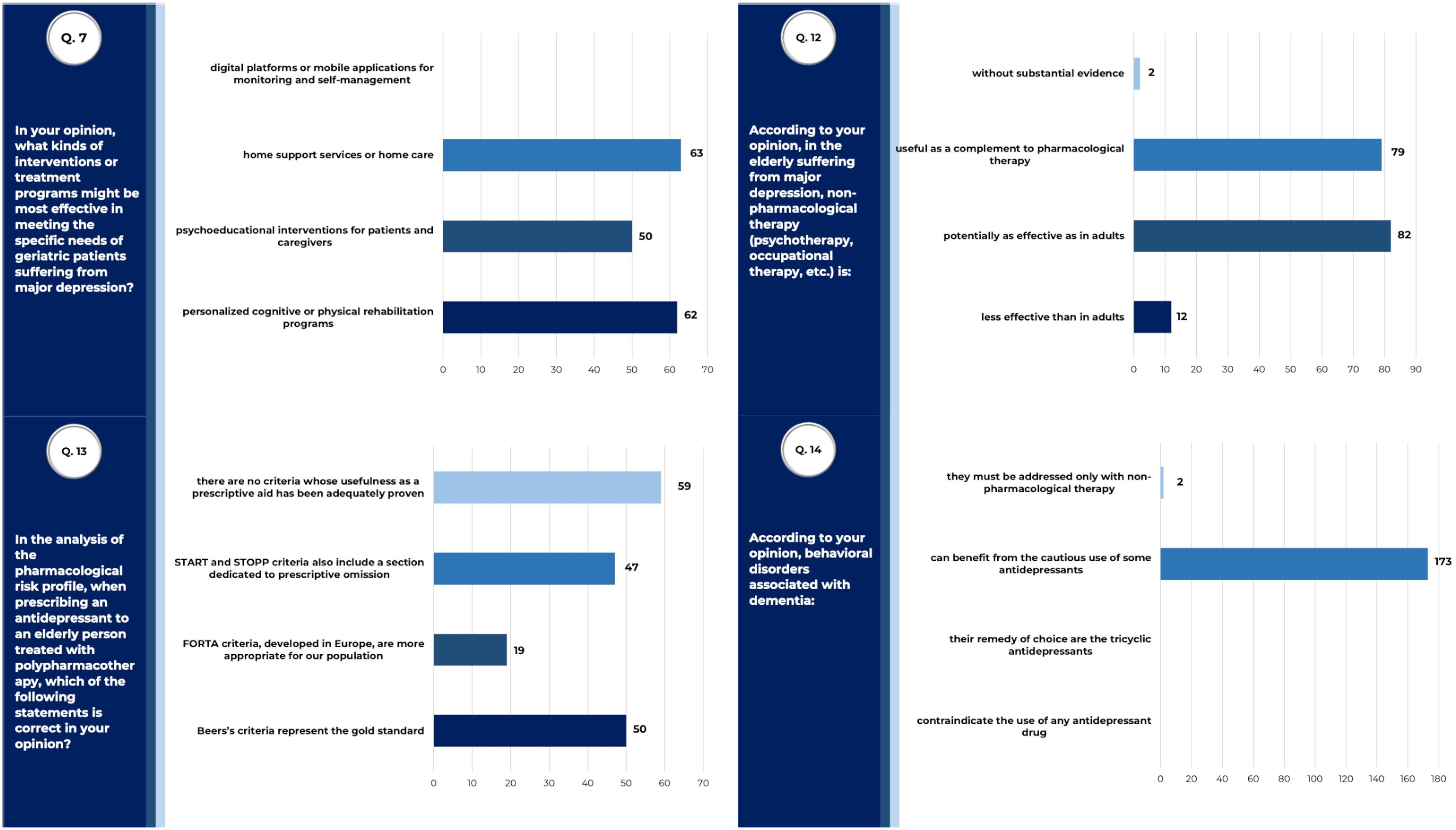 Figure 4. Therapeutic approaches to geriatric depression. Answers to queries 7, 12, 13 and 14 of the questionnaire submitted to SIGG members, relative to results described. Raw data are reported (tot. surveyed physicians =175).