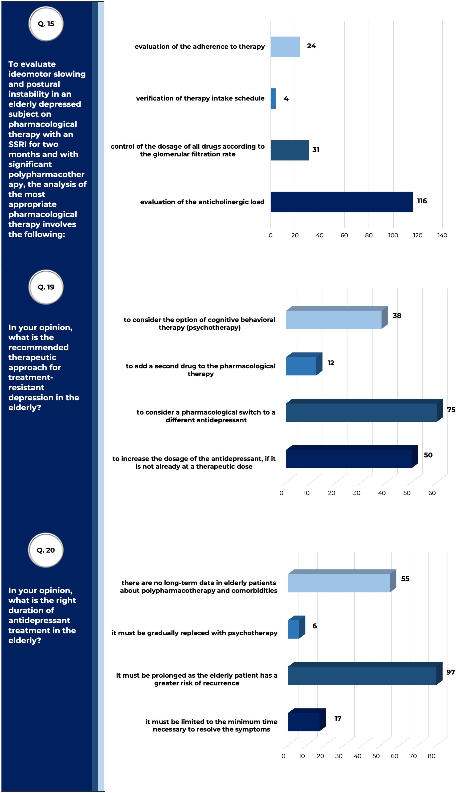 Figure 5. Strategies and safety of pharmacological treatments in geriatric depression. Answers to queries 15, 19 and 20 of the questionnaire submitted to SIGG members, relative to results described. Raw data are reported (tot. surveyed physicians =175).