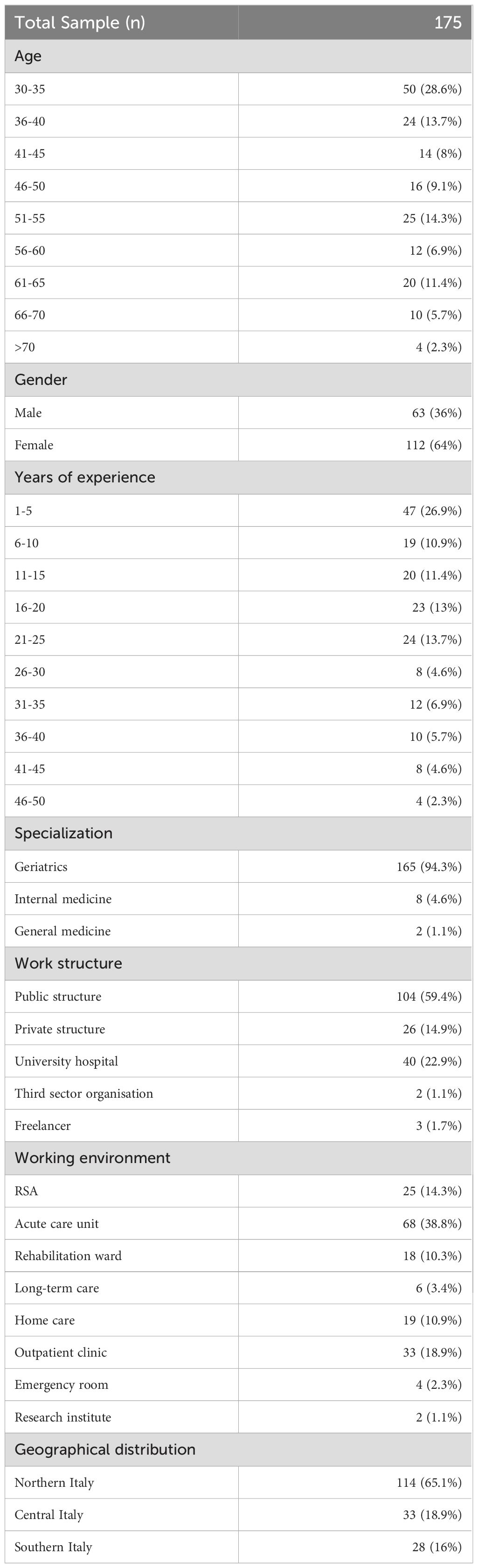 As above mentioned, a total of 175 geriatrics-working physicians responded to the survey, with an approximate response rate of 20%, as compared to the total amount of SIGG active registered physicians. The following results are presented showing both the raw number of respondents on the total and the calculated respective percentage. Both results and figures have been organized in thematic clusters resembling those debated by the experts (see Methods).
