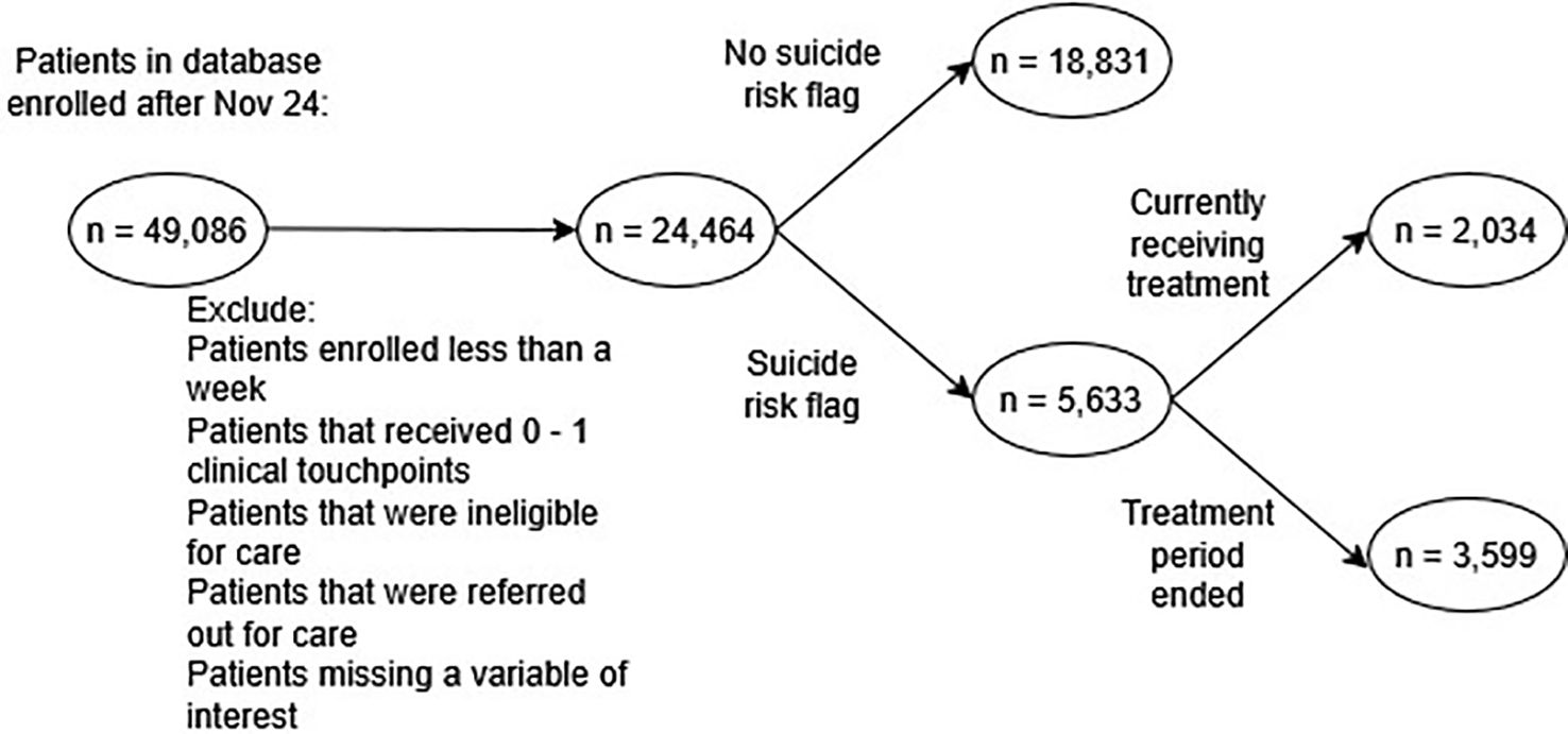 Sample diagram. Figure 2 shows the flow of patients included in the analysis. The Concert Health electronic health system database had 49,086 patients records whose enrollment began after November 24, 2021. These patients were filtered through the initial screening criteria. Patients were removed if they did not actually receive care within the system (too few days enrolled, too few touchpoints, ineligible for care or referred out for care). If a patient was missing any variable of interest, they were removed during initial selection. Finally, only patients flagged at risk for suicide with closed treatment periods were included, resulting in a final sample size of 3,599.