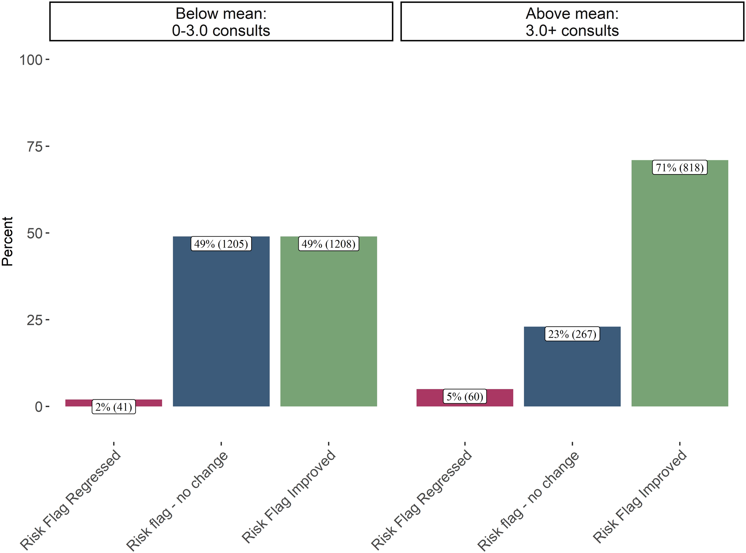 Final risk flag by psychiatric consultations received (n = 3,599). This plot shows patients’ discharge status compared to psychiatric consultations. 71% of patients that received the most psychiatric consultations discharged with an improved risk flag. In contrast 49% of patients that received the fewest psychiatric consultations were discharged with no change in risk flag. This plot suggests that patients’ receiving an above average number of psychiatric consultations are less likely to see no change in their risk flag.