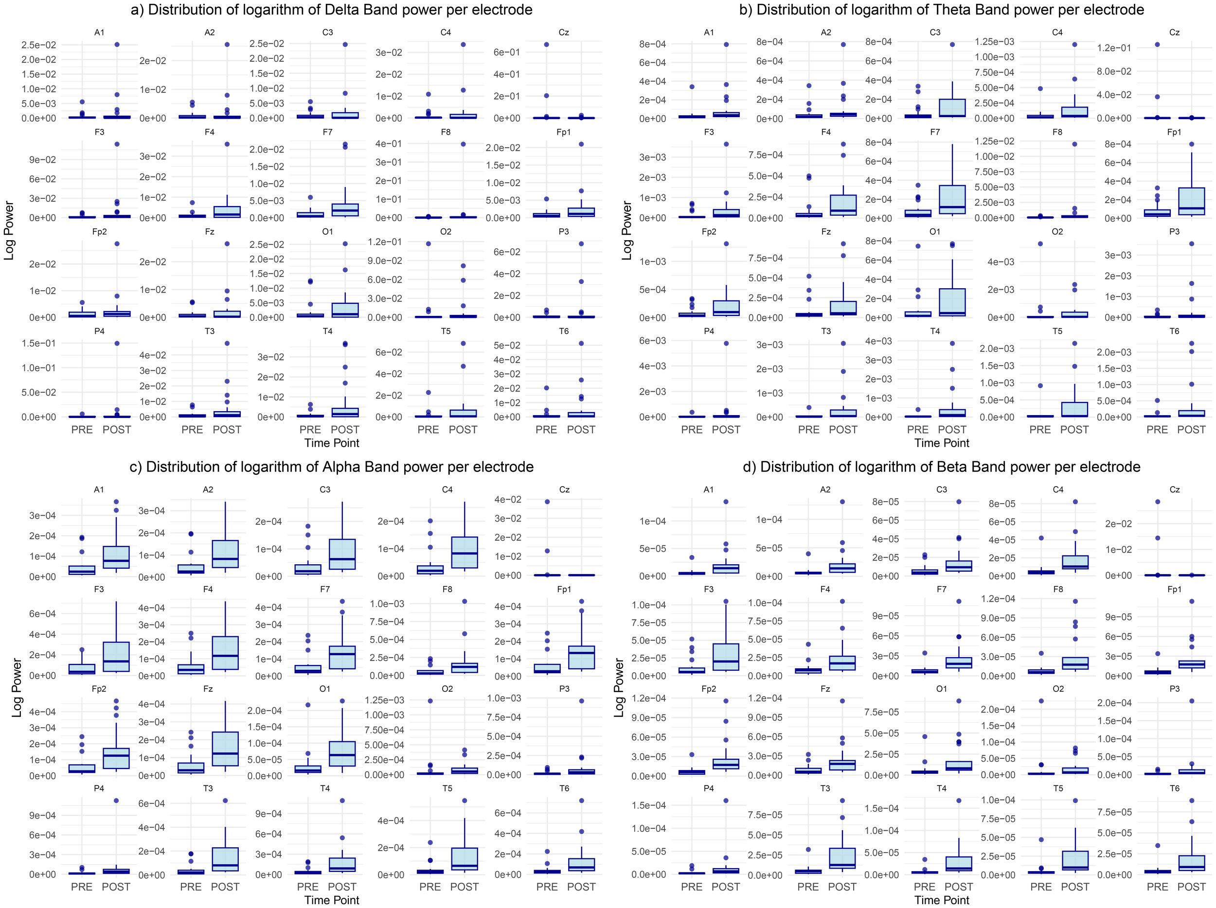 EEG data were processed to evaluate within-subject effects pre- and post-psilocybin use. The analysis focused on changes in functional connectivity associated with the TBIs, aiming to identify alterations in brain network dynamics associated with the therapeutic effects of psilocybin. Statistical comparisons were performed on band-specific EEG measures across canonical frequency bands (delta, theta, alpha, beta). Paired, non-parametric Wilcoxon signed-rank tests were used to assess differences in both spectral power and variance across electrodes within each frequency band. To evaluate inter-band distinctions, pairwise comparisons were conducted between delta and each of the higher frequency bands, as well as between theta and alpha, within each subject. P-values were transformed using the negative base-10 logarithm (–log10(p)) for interpretability, with values exceeding 1.3 indicating statistical significance at p < 0.05. False discovery rate (FDR) correction was applied to control for multiple comparisons across electrodes. This approach enabled spatially resolved identification of significant changes in oscillatory dynamics and enhanced network differentiation following psilocybin administration. Full descriptions of the EEG analysis are provided in the Supplementary Material S2.