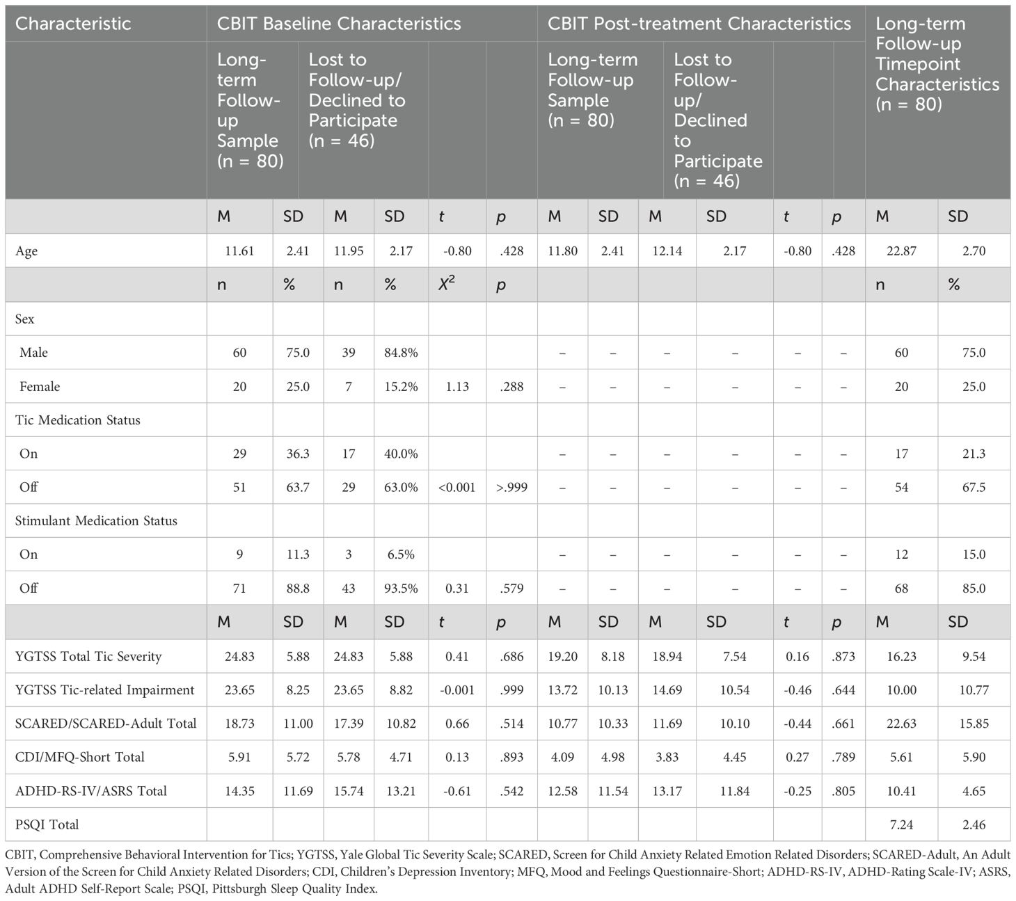 Inclusion criteria for the original trial included an age of 9 to 17 years; diagnosis of Tourette’s disorder, chronic motor tic disorder, or chronic vocal tic disorder, moderate or greater severity as measured by a Yale Global Tic Severity Scale (YGTSS; 37) Total score >13 (>9 for chronic motor tic disorder or chronic vocal tic disorder); fluency in English; and an intelligence quotient > 80. Exclusion criteria included the need for immediate treatment or change in current treatment for any of the co-occurring psychiatric disorders allowed at study entry: ADHD, obsessive–compulsive disorder, anxiety disorders, depressive disorders, or oppositional defiant disorder; changes in the dosage or schedule of any psychotropic medications within six weeks of study enrollment or planned changes or initiation during the study; unstable medical condition; current diagnosis of substance abuse/dependence; lifetime diagnosis of pervasive developmental disorder, mania or psychosis; or ≥ 4 sessions of habit reversal training (9). Of the original CBIT sample (n = 126), 30 were lost to follow and 16 declined to participate. See Table 1 for baseline and post-treatment (10-week) demographic and clinical characteristics for participants who completed long-term follow-up (n = 80) and participants who were lost to follow up or declined to participate (n = 46). At follow-up, the sample ranged in age from 16 to 30 years (M = 22.87, SD = 2.70), was predominantly male (n = 60, 75.0%) and of non-Hispanic/Latino (n = 73, 91.2%) ethnicity. Participants endorsed white (n = 69, 86.3%), Black (n = 1, 1.3%), Asian (n = 4, 5.0%), multi-racial (n = 4, 5.0%), and other racial (n = 2, 2.5%) backgrounds. The majority of the sample were single/never married (n = 66, 82.5%) and had attained some college education or higher (n = 57, 71.3%). Half of the sample were employed (n = 40, 50.0%). See Espil et al. (34) for further methodological details.