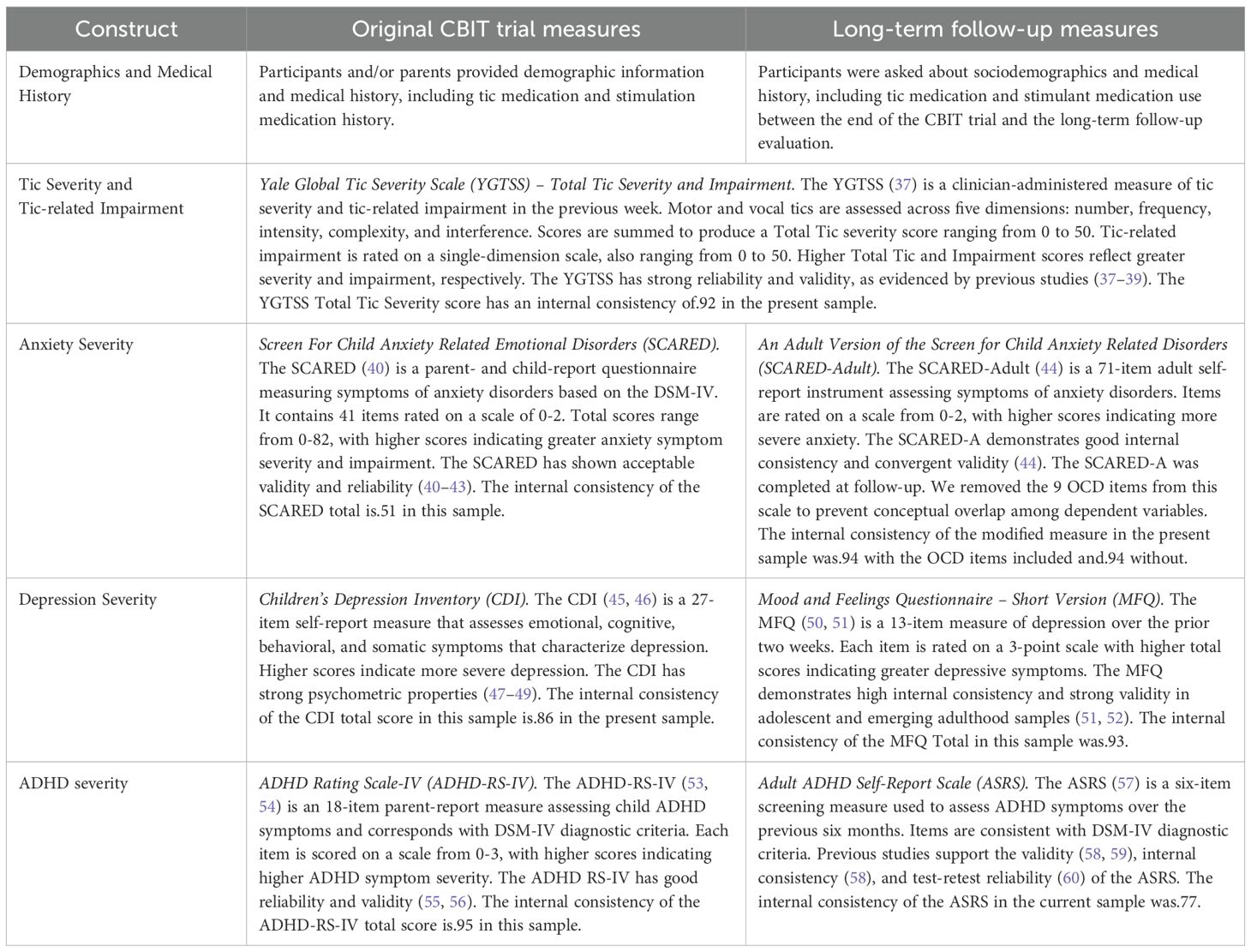 Long-term Follow-up Assessment: At long-term follow-up assessment, participants from the original trial were recruited from two of the three original CBIT sites: University of California, Los Angeles (n = 32), Marquette University (n = 22), and Weill Cornell University (n = 26) due to the move of the original Johns Hopkins University principal investigator to that university. Adults provided institutional review board-approved informed consent for their participation. The three child participants (aged 16–17 years) provided assent, and their parents provided parent permission. The follow-up evaluation was completed in person or via web-based videoconferencing as needed. Independent evaluators (IEs) with a bachelor’s degree or higher, masked to original treatment assignment, and trained to reliability on clinical interviews (i.e., received didactic training and achieved reliable ratings on two consecutive interview administrations; see 34), evaluated psychiatric diagnosis (Mini International Neuropsychiatric Interview; MINI; 67), tic severity, and tic-related impairment (YGTSS). Participants rated sleep (PSQI Total), anxiety severity (An Adult Version of the Screen for Child Anxiety Related Disorders; SCARED-Adult; 44), depressive symptom severity (Mood and Feelings Questionnaire – Short Version; MFQ; 50), and ADHD symptom severity (Adult ADHD Self-Report Scale; ASRS; 57).