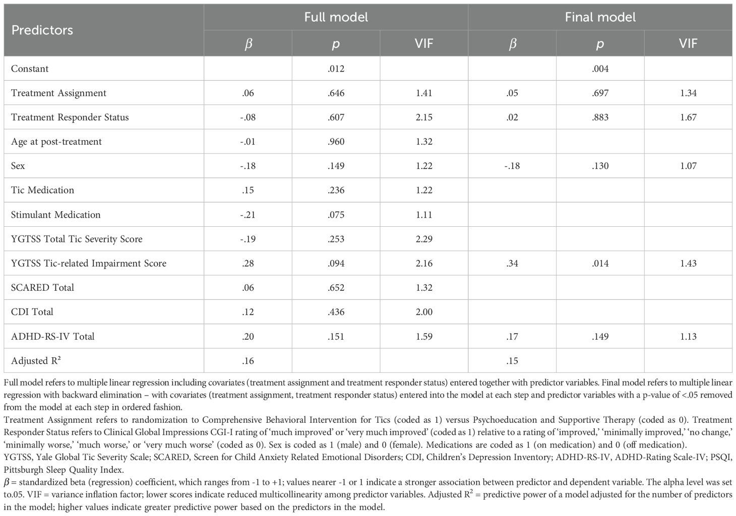 In the full model, there were no significant post-treatment (10-week) predictors of PSQI Total at long-term follow up (see Table 3 and Supplementary Table 3). The full model explained 16% of the variance in PSQI Total score at long-term follow-up. In the final model, three predictors were retained, including sex (i.e., female), YGTSS Tic-related Impairment score, and ADHD-RS-IV Total score. Of these, YGTSS Tic-related Impairment score (β = .34) was a statistically significant predictor of PSQI Total score (see Table 3 and Supplementary Table 3). Sex and ADHD-RS-IV Total score were retained in the final model despite p-values >.05 based on parsimony; together, these three variables reflected the simplest model while preserving adjusted R2. The final model explained 15% of the variance in PSQI Total score.