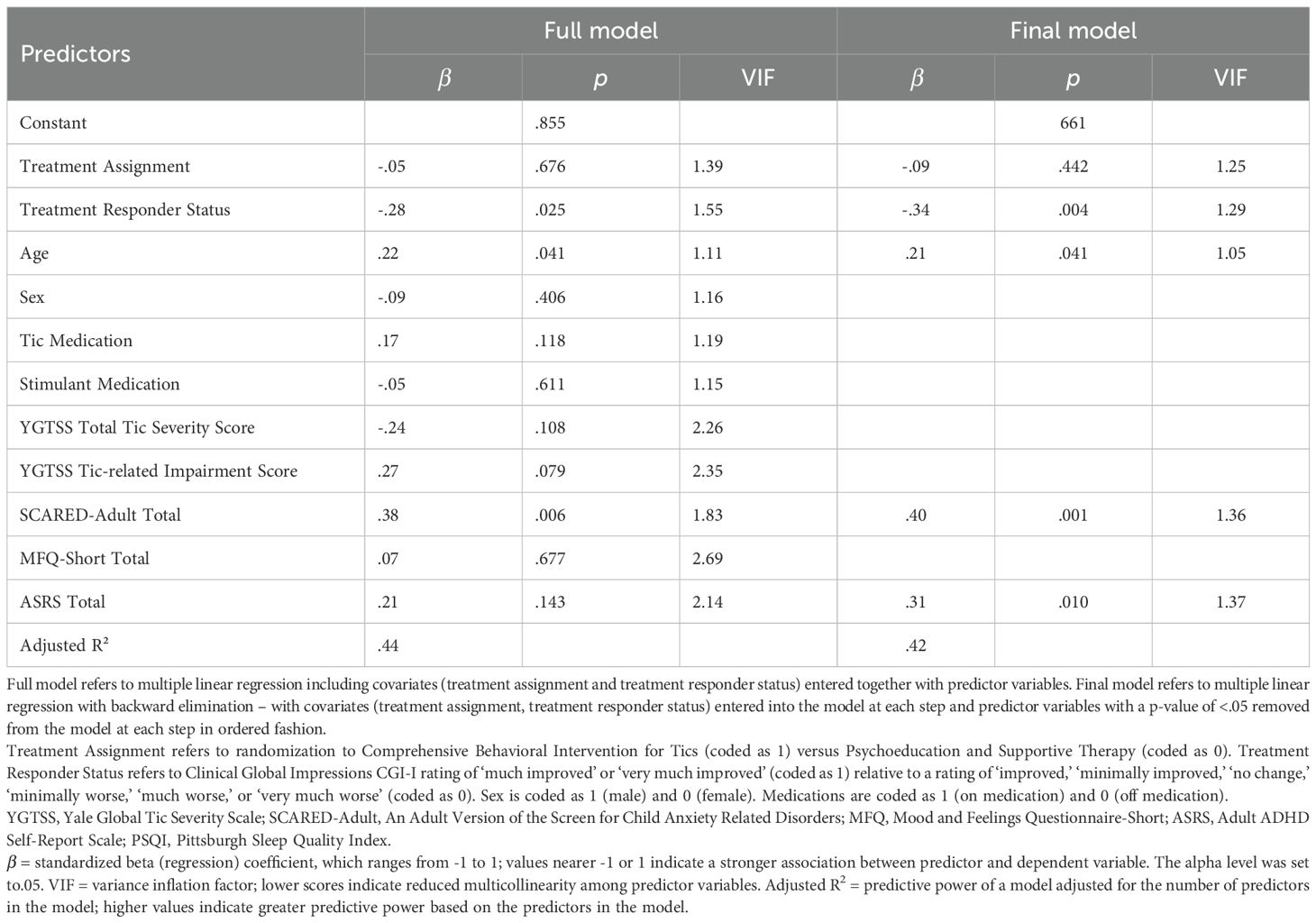 Analyses were conducted using SPSS 28.0. Descriptive statistics, including means and frequencies, are presented to characterize the sample with respect to demographics. Multiple linear regression was performed to examine whether post-treatment (i.e., 10-week timepoint of original CBIT trial) variables (including sex, tic medication status, stimulant medication status, YGTSS Tic Severity Total, YGTSS Impairment, SCARED Total, CDI Total, and ADHD-RS-IV Total) were predictors of the PSQI Total score at long-term follow-up. Multiple linear regression was also performed to examine whether variables measured at long-term follow-up (sex, tic medication status since the trial ended, stimulant medication status since the trial ended, YGTSS Tic Severity Total, YGTSS Tic-related Impairment Total, SCARED-Adult Total, CDI Total, and ADHD-RS-IV Total) were significant predictors of PSQI Total score. In both analyses, treatment assignment (CBIT versus PST), and treatment responder status (i.e., CGI-I rating of ‘much improved’ or ‘very much improved’ relative to a rating of ‘improved,’ ‘minimally improved,’ ‘no change,’ ‘minimally worse,’ ‘much worse,’ or ‘very much worse’) were included as covariates to account for prior tic treatment effects.
