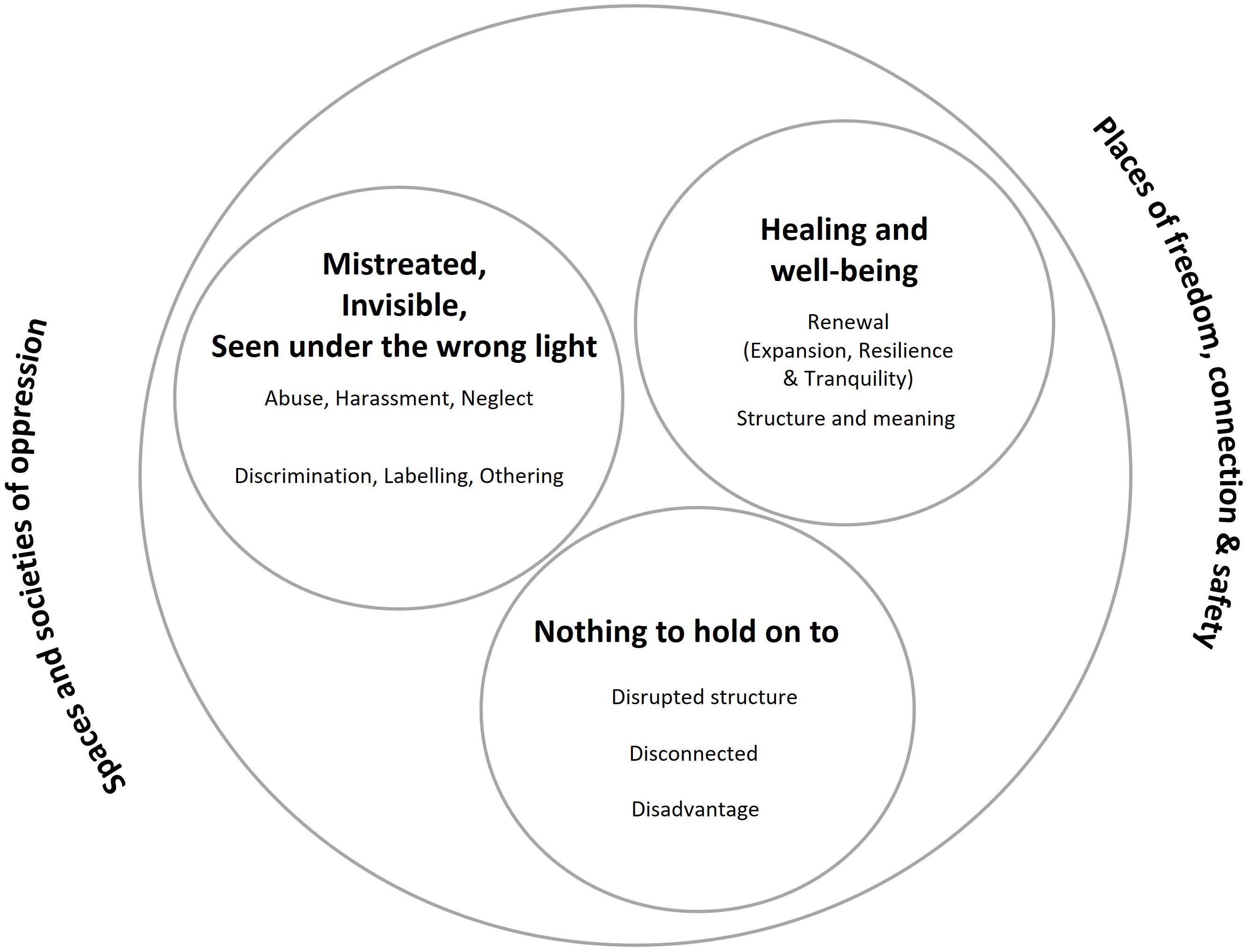 Physical and societal spaces described as oppressive were seen by participants as fomenting mistreatment and marginalization, as well as precarity, instability and isolation. On the other hand, spaces that fostered freedom, inclusivity and connection were described as contributing to safety, meaning, well-being and healing. Although not exclusive to minoritized groups, experiences of precarity, mistreatment and discrimination were more frequently described by and seemed more pervasive to participants belonging to minoritized groups. They were also more likely to be subjected to oppressive societal circumstances and face greater barriers to accessing sources of well-being and structure. Disconnection, alienation and isolation, whilst reported by all demographic groups, seemed more poignant among minoritized participants. This is understandable, given that experiences of displacement, othering, and marginalization, that are all more common among minoritized communities, were described by many participants as being at the root of exclusion and isolation.