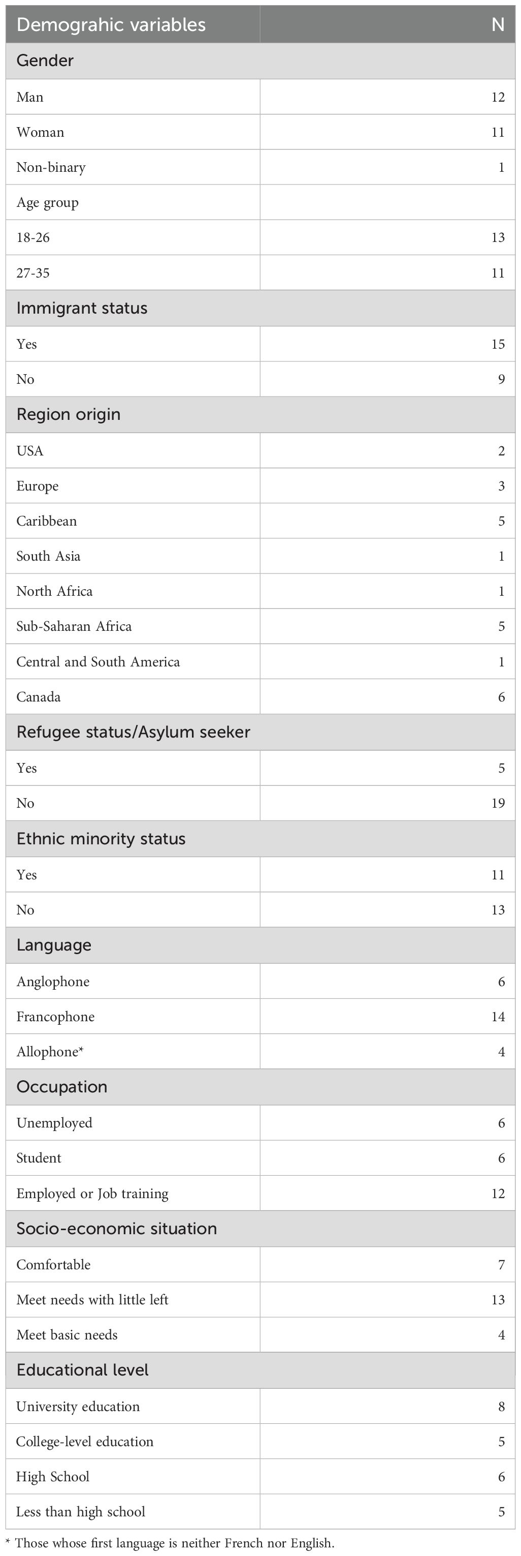 Twenty-four participants were recruited. 12 participants were men, 11 self-identified as an ethnic minority, 18 belonged to a linguistic minority (not francophone), and 15 were first-generation immigrants (five had refugee status or were asylum seekers). Among first- and second-generation immigrants, most were of Sub-Saharan African (n=5) and Caribbean heritage (n=5) (Table 1).
