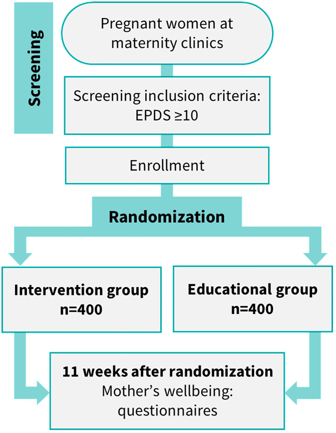 All the women attending maternity clinics in the study areas are given an envelope during the first face-to-face health visit at 8–10 weeks of gestation. This includes an information letter, an informed consent document, and the EPDS questionnaire. Healthcare professionals also give the women verbal information about the ongoing study. The women are asked to complete the forms by the next clinic check-up at 13–18 weeks and provide informed consent if the research team is allowed to contact them about taking part in the RCT. The women are also provided with contact details for the study team in case they have any questions.