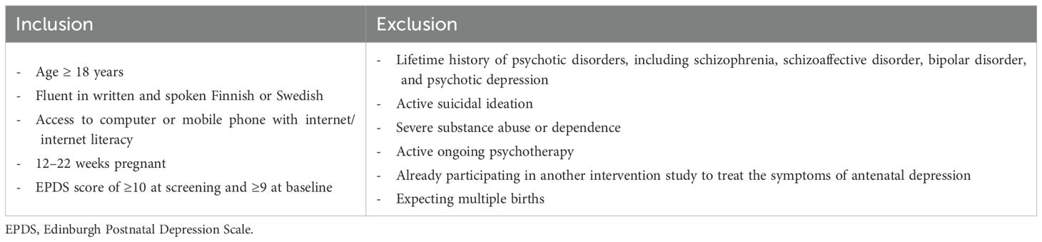 If the woman is eligible, she is asked to provide informed consent on a secure website. At the start of the baseline assessments, the women fill in the EPDS again to assess how stable their depressive symptoms are. If they score at least 9 points, they proceed to the full digital baseline assessment. If they score 8 points or less, they are excluded. A separate phone call is made after the baseline questionnaires. In this phone interview, the women are assessed using selected sections of the structured diagnostic interview, Mini-International Neuropsychiatric Interview (MINI) (29). The included sections cover depression, suicidality, bipolar disorder, and anxiety disorders. If the woman reports current suicidality, she is excluded from the study and referred to appropriate services. Other exclusion criteria include psychotic and bipolar disorders, substance abuse, active ongoing psychotherapy, participating in another intervention, and multiple pregnancy (Table 1). The women can be referred to local healthcare services if more individual treatment is considered necessary, and the coaches can also consult a psychiatry specialist at any time.