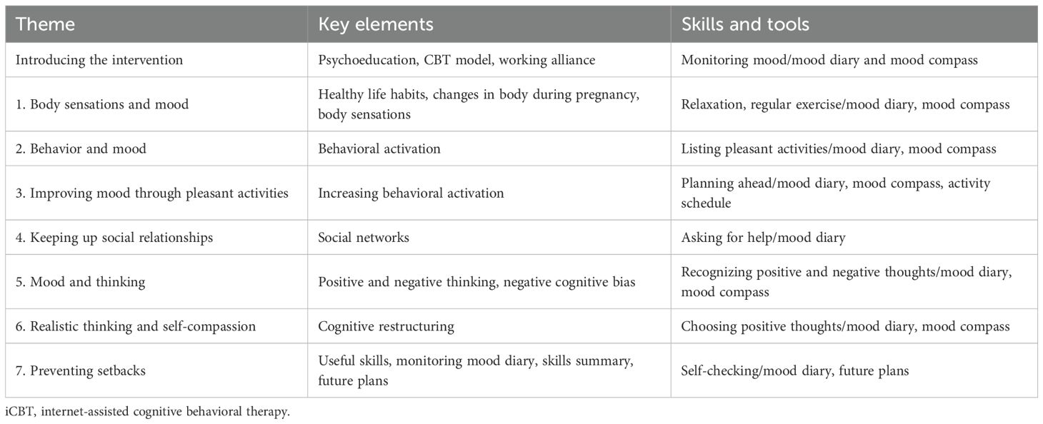 Stronger Together is a targeted iCBT intervention for pregnant women with depressive symptoms who score ≥9 points on the EPDS. It is based on the Coping with Depression course, which has been effective in preventing and treating depression in several RCTs and has been implemented in different target populations and settings (30). The highly structured Stronger Together intervention includes basic CBT components: psychoeducation, behavioral activation, coping with social relationships, cognitive restructuring, and preventing setbacks (Table 2). It comprises seven-weekly themes on a digital platform and weekly phone coaching. There will also be two booster sessions, approximately 2 and 7 months after the birth, including a phone call and a digital component. No physical visits or face-to-face communication are included. The aim is to strengthen the expectant mother’s coping skills. The phone coaches are specially trained healthcare professionals who support and motivate the women. The weekly phone sessions are scheduled when they are most convenient for the women. To ensure the fidelity and quality of the intervention, the phone coaches receive weekly supervision by two experienced CBT therapists, including case consultations, intervention management, and support on the use of CBT principles during the coaching process.