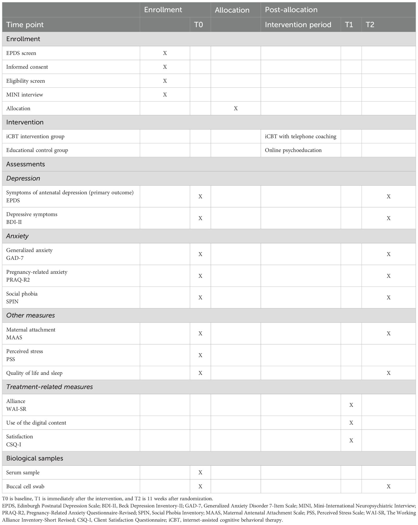 iCBT, internet-assisted cognitive behavioral therapy; SPIRIT, Standard Protocol Items: Recommendations for Interventional Trials; CBT, cognitive behavioral therapy; RCT, randomized controlled trial; EPDS, Edinburgh Postnatal Depression Scale; MINI, Mini-International Neuropsychiatric Interview; BDI-II/BDI, Beck Depression Inventory-II; GAD-7, Generalized Anxiety Disorder 7-Item Scale; PRAQ-R2, Pregnancy-Related Anxiety Questionnaire; SPIN, Social Phobia Inventory; PSS, Perceived Stress Scale; MAAS, Maternal Antenatal Attachment Scale; WAI-SR, Working Alliance Inventory-Short Revised; CSQ-I, Client Satisfaction Questionnaire for internet-based interventions; ANCOVA, analysis of covariance; TIDieR, Template for Intervention Description and Replication.