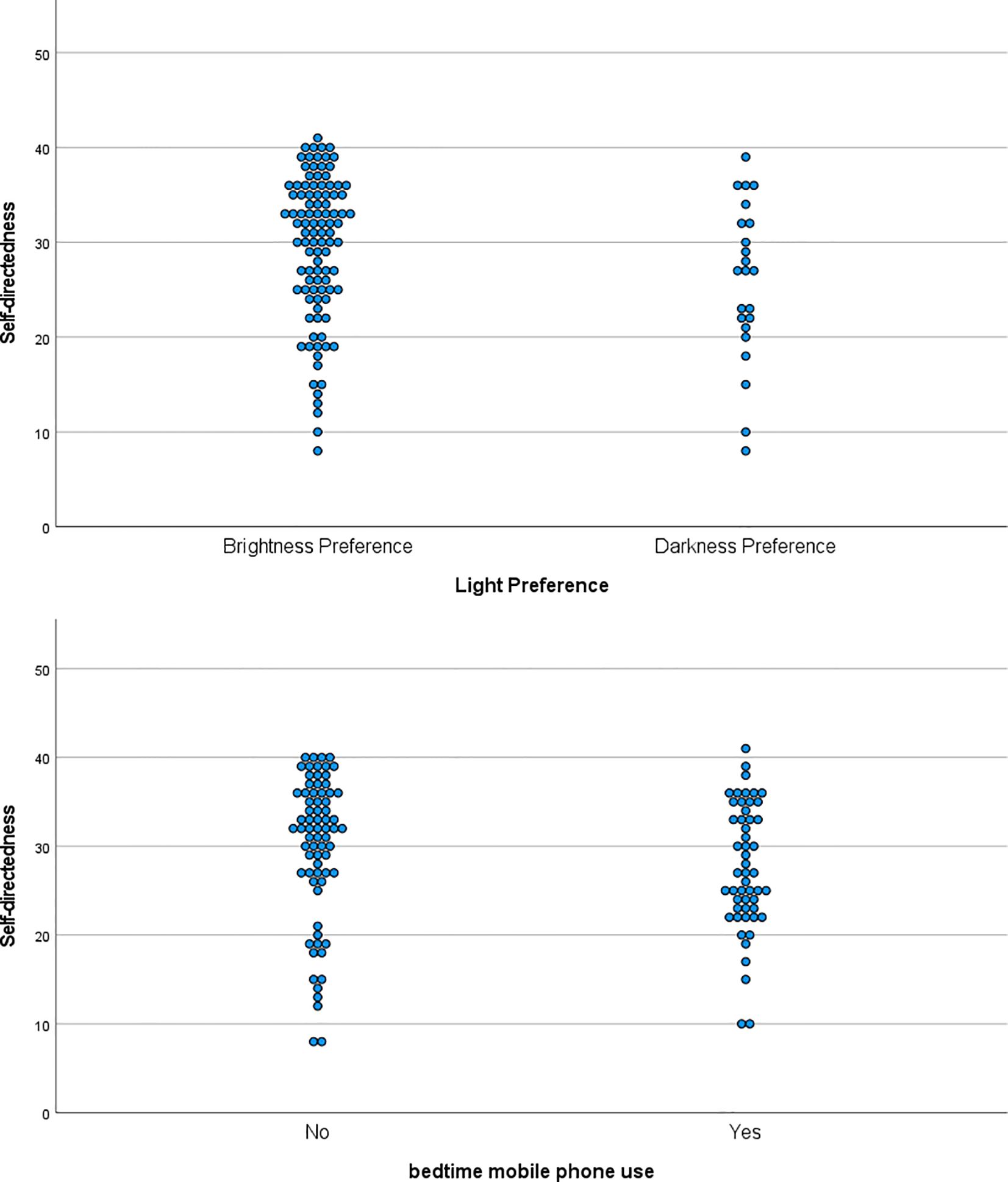 Figure 1. Self-directedness, brightness preference, and no bedtime mobile phone use. Self-directedness was significantly associated with brightness preference than darkness preference. Self-directedness was significantly associated with no bedtime mobile phone use.