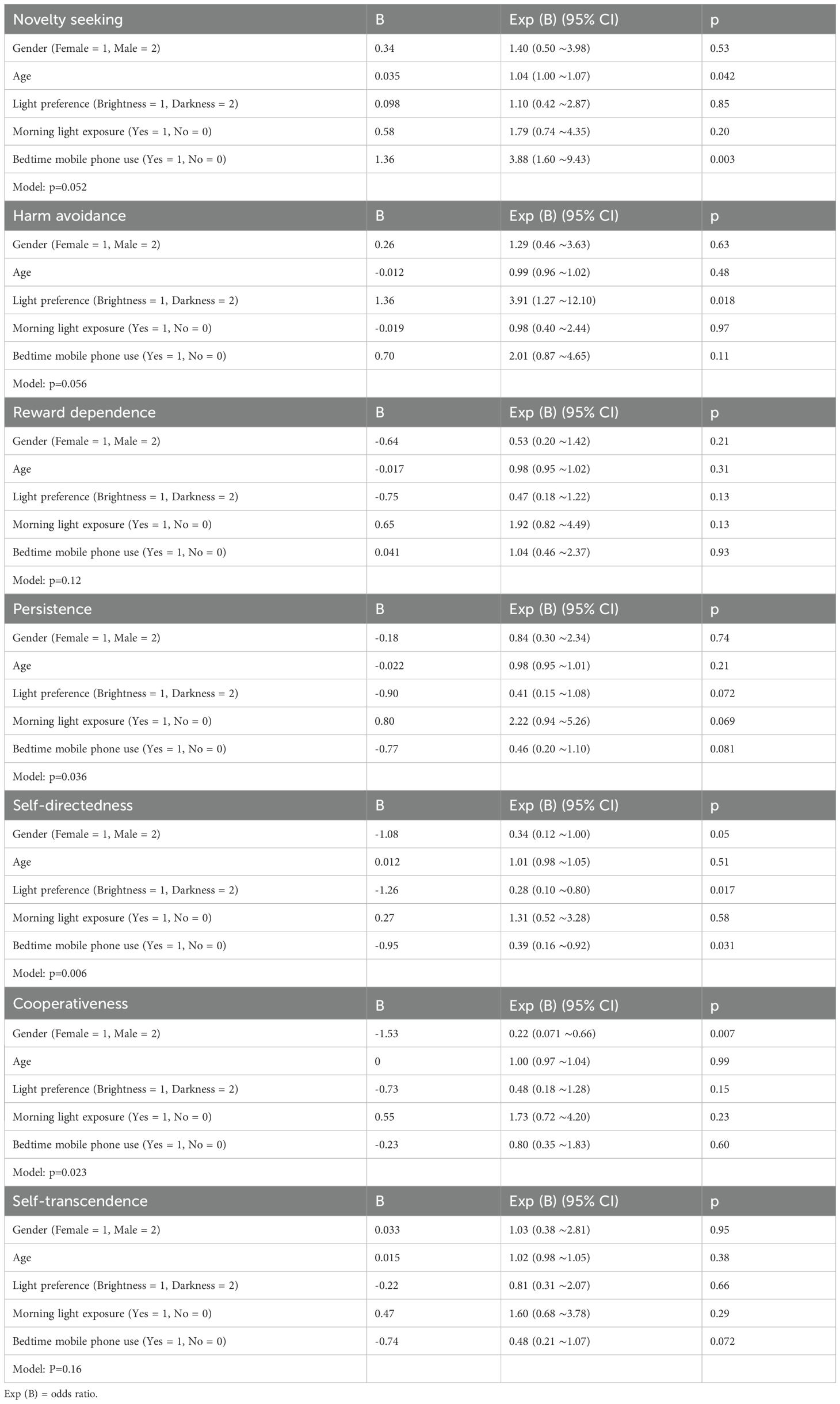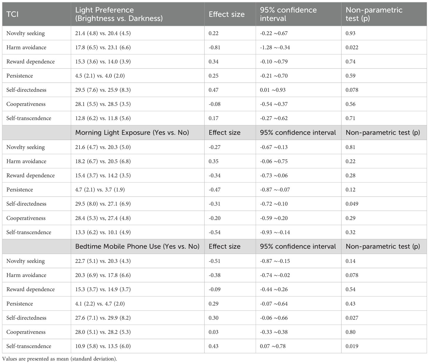 As shown in Table 2, participants with darkness preference scored significantly higher harm avoidance scores than those with brightness preference. Participants who reported morning light exposure had significantly higher self-directedness scores than those without morning light exposure. Bedtime mobile phone users had significantly lower self-directedness and self-transcendence scores than non-users.