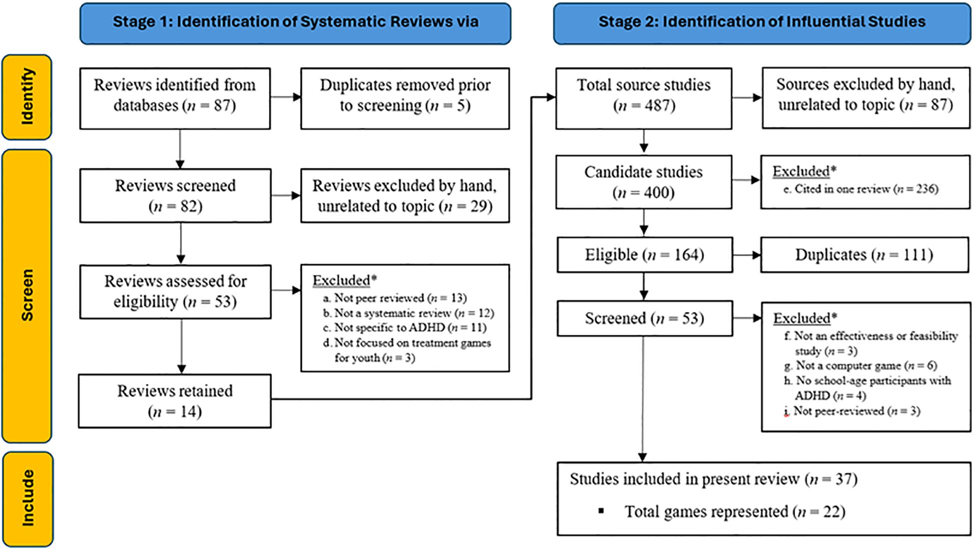 Figure 1. Flow Diagram of Two-stage Literature Review Process to Identify Influential Studies of ADHD Games.