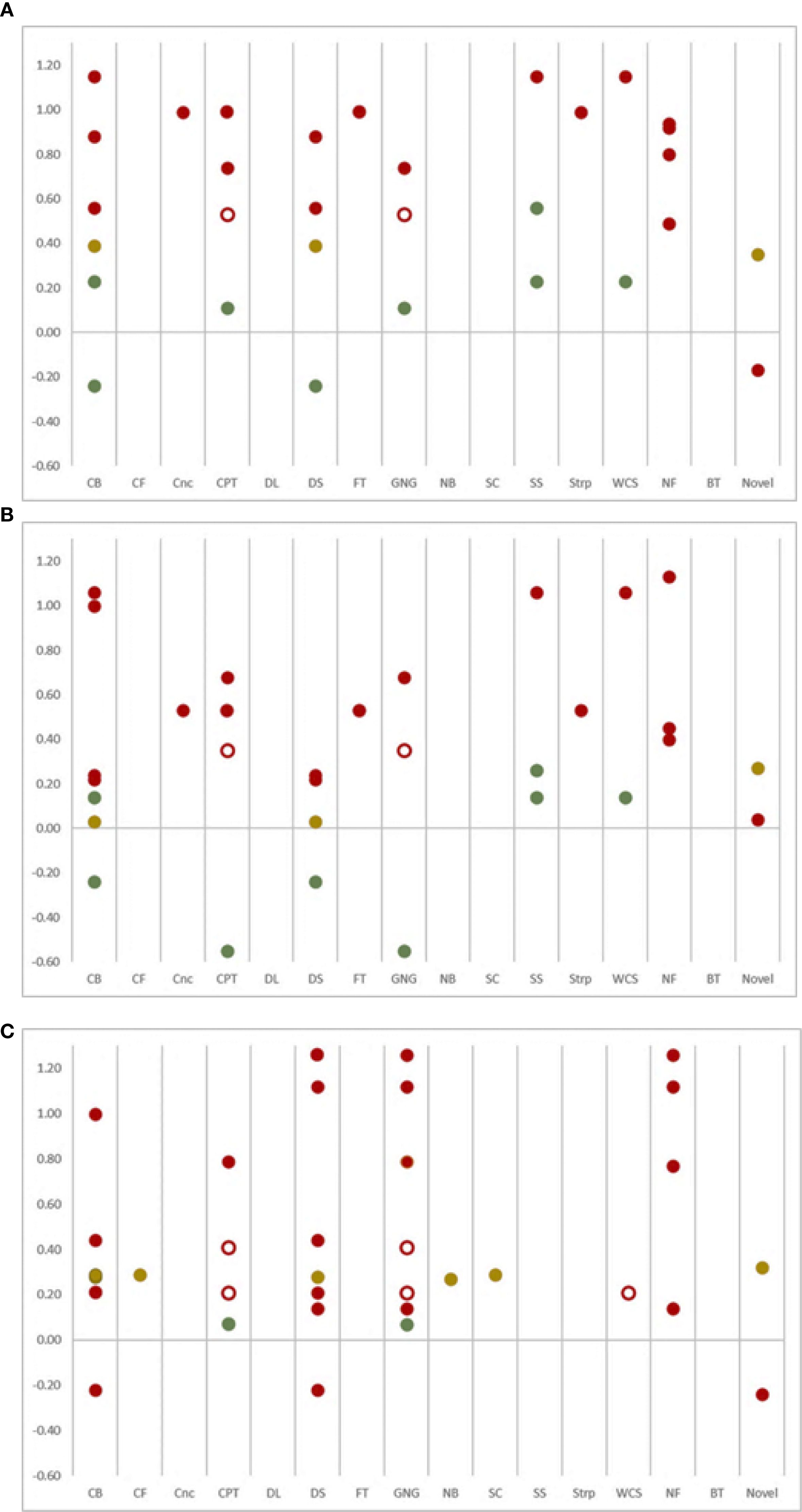 Figure 2. Bubble Plots of Effect Sizes for (A) Inattention, (B) Hyperactivity-Impulsivity, and (C) Combined ADHD Symptoms as Rated by Parents, by Game Content from Low Risk (Green), Some Risk (Yellow) and High Risk (Red) results. Category determinations that were not corroborated by the corresponding authors are indicated with empty bubbles. CB, Corsi block-tapping task; CF, Complex figure task; Cnc, Cancellation task; CPT, Continuous performance task; DL, Dreary-Liewald task; DS, Digit span task; FT, Flanker task; GNG, Go/no-go task; NB, n-back task; SC, Stockings of Cambridge task; SS, Stop signal task; Strp, Stroop task; WCS, Wisconsin card sorting task; NF, Neurofeedback; BT, Behavior therapy.