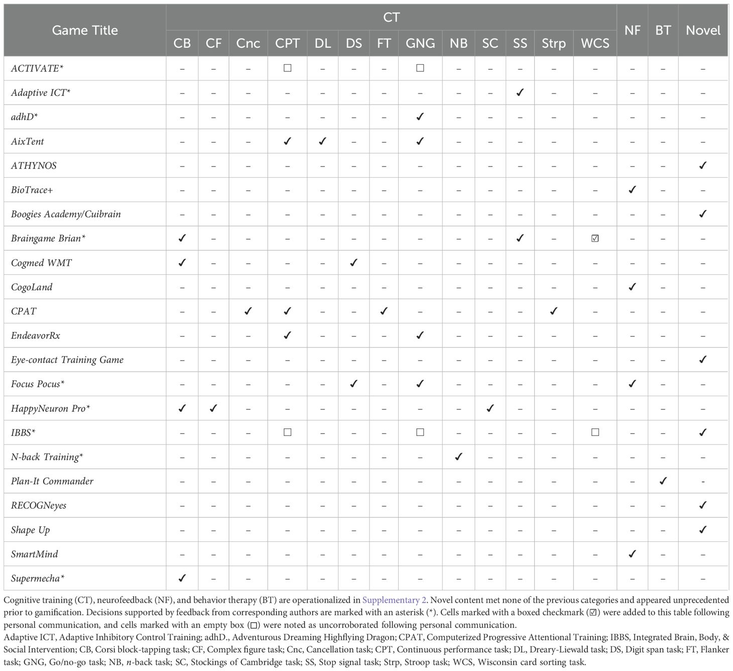 When necessary, we collected supplemental game descriptions from additional sources referenced in the articles or by searching scholarly databases for product descriptions, game overviews, or secondary publications using the game title as a search term (see Supplementary 2). For clarity, games that have undergone title changes were combined and attributed to the most recent title (e.g., EndeavorRx). We then coded the specific game elements intended to have clinical impact based on definitions of established assessment and treatment practices. To guide this work, we iteratively developed a codebook that functioned as a review protocol (see Supplementary 3). The most challenging step was operationalizing CT tasks. As a starting point, we relied on the review by Molitor and Langberg (27) to identify the task paradigms in the ADHD literature, and then operationally defined the tasks tested most often. When gamified, laboratory tasks are often altered (e.g., moving targets in the Corsi block-tapping paradigm), so in addition to our definitions we listed likely modifications. Game elements asserted to be therapeutic that were unlike our codes were reviewed by the team, compared to the relevant literature, and either added to our codebook or deemed “novel” if no precedent could be identified.