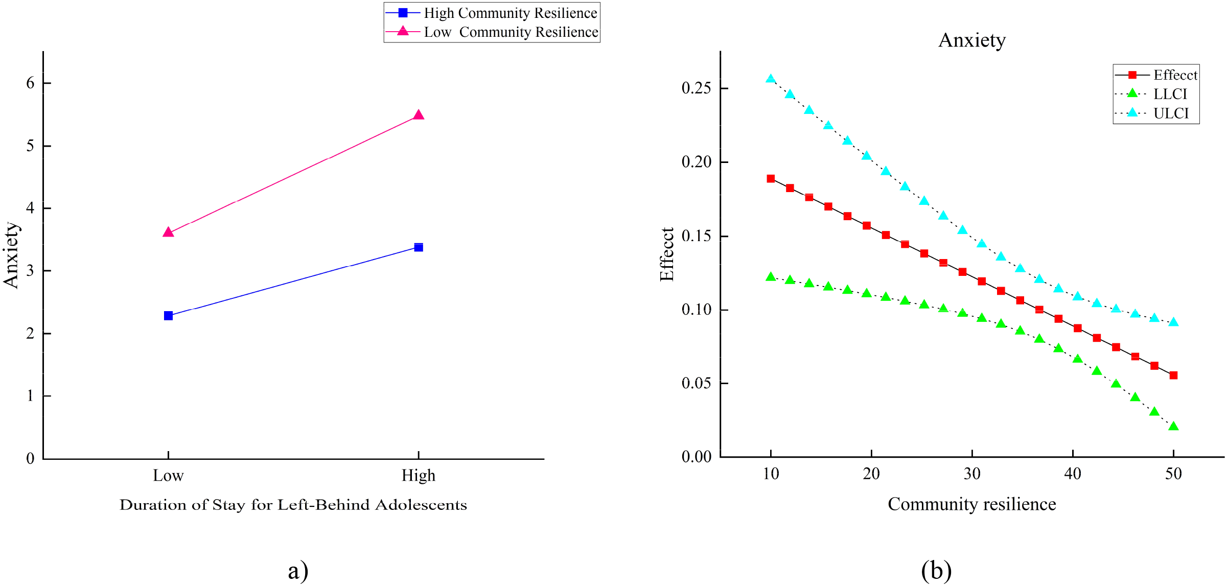 The duration of left-behind status was significantly and positively associated with depressive and anxiety symptoms. Perceived community resilience was negatively associated with these outcomes and moderated the relationship between left-behind duration and mental health. Specifically, higher levels of community resilience attenuated—but did not eliminate—the adverse effects of prolonged parental absence.