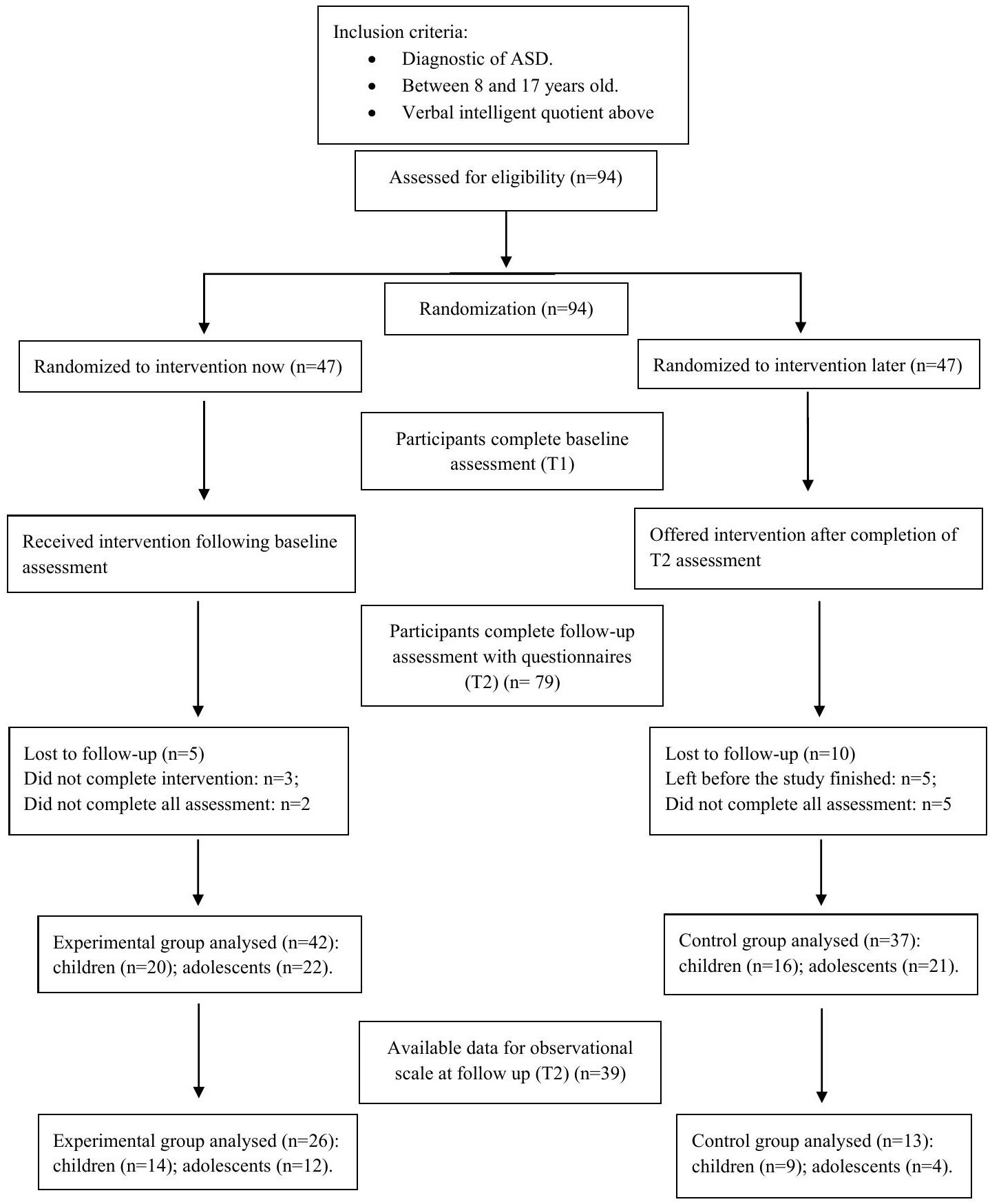 A total sample of 94 participants was divided into two age groups: children (8 to 12 years old, n=36) and adolescents (13 to 17 years old, n=43). Subjects were paired according to age, sex, and verbal IQ; then each pair was randomized between the two groups (experimental group and waiting-list control group) using R software (R Foundation for Statistical Computing; Vienna, Austria) with a fixed random seed (see the Consort Diagram in Figure 1).