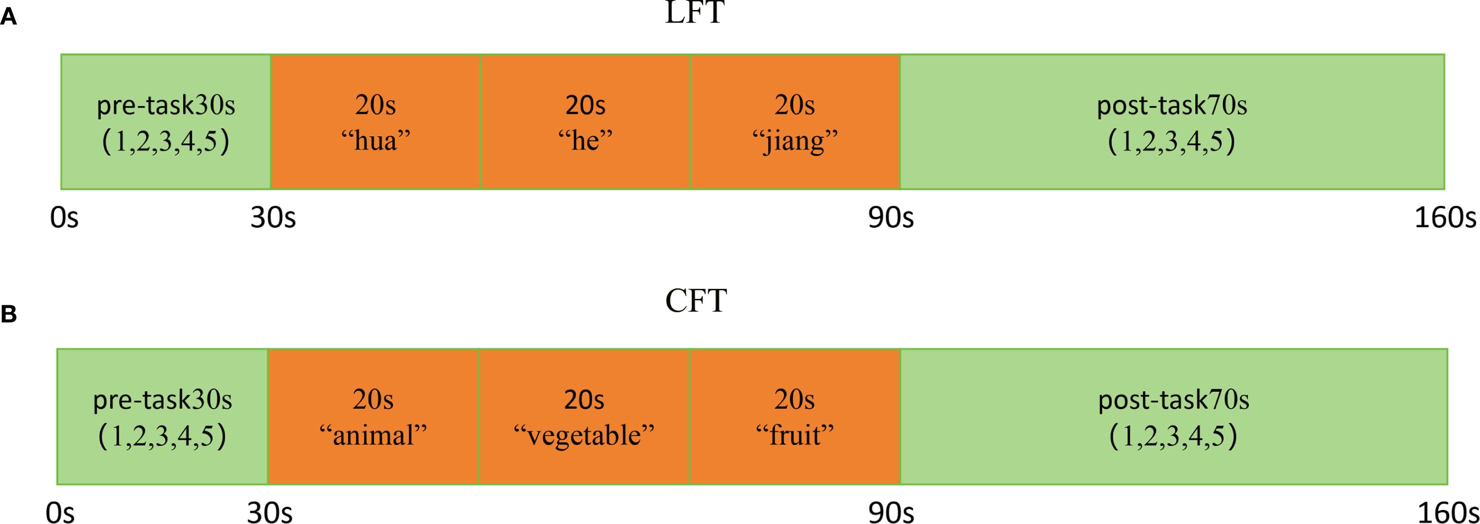 Figure 1. Activation task design. (A) LFT and (B) CFT. The activation task is divided into three phases: a 30s pre-task, a 60s task period, and a 70s post-task period.